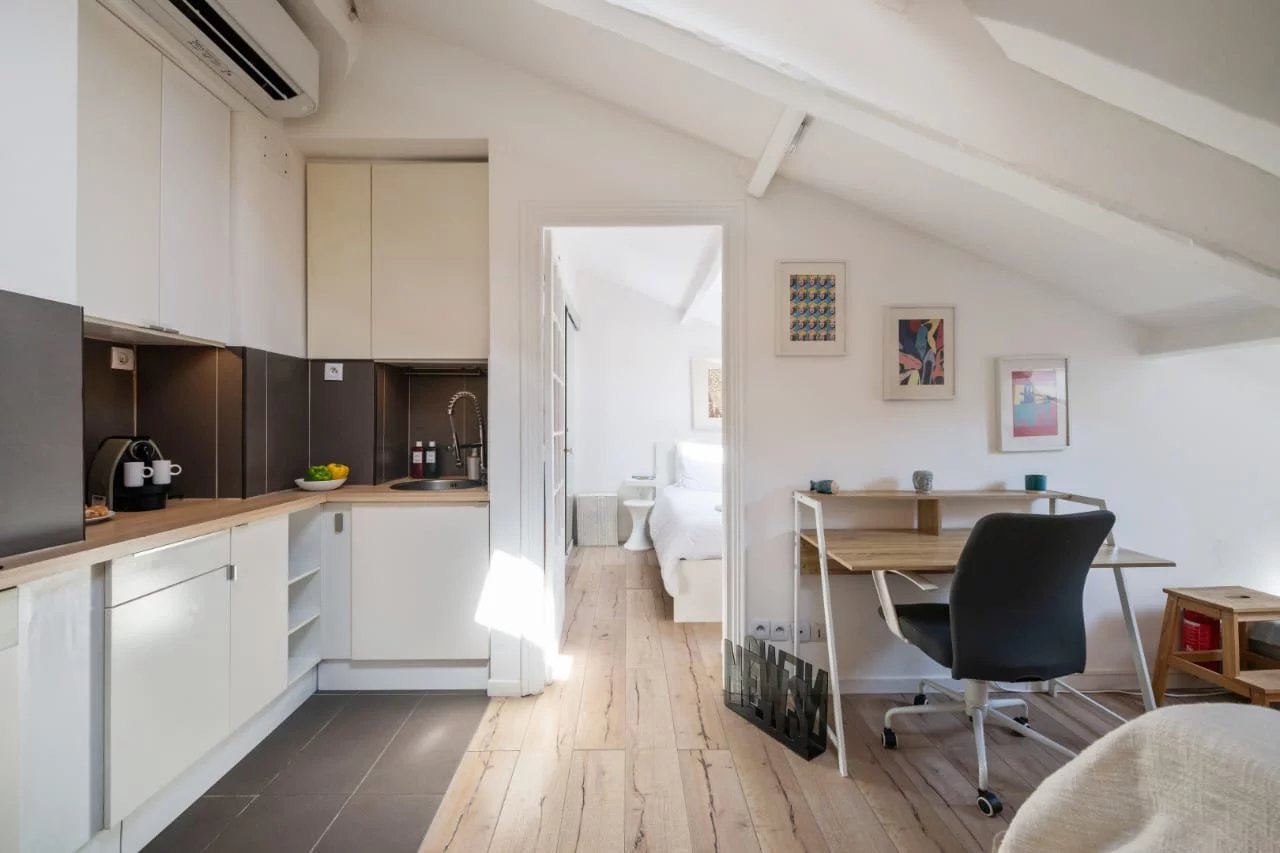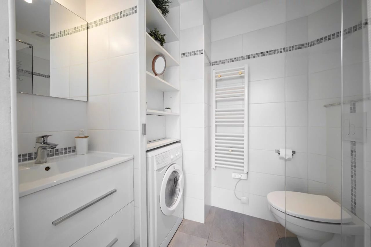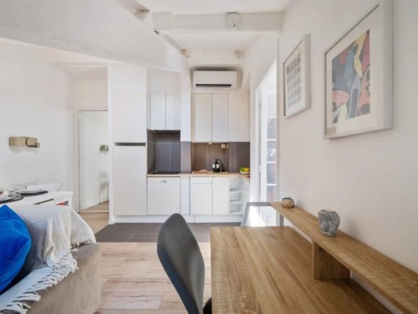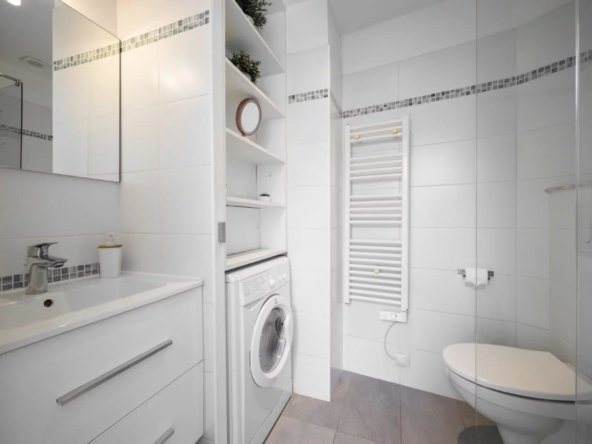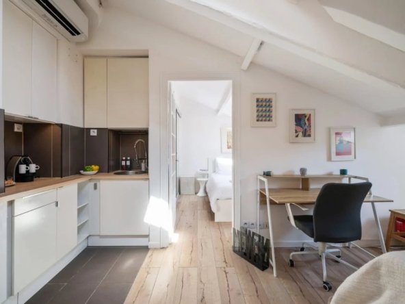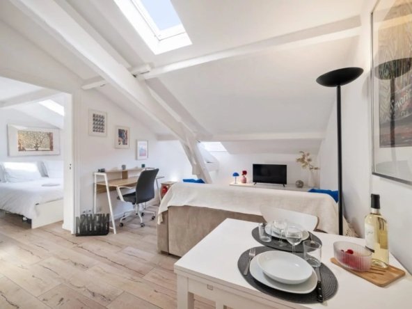 D’une superficie de 23 m² loi Carrez / 33 m² au sol, il est entièrement meublé et équipé (climatisation, lave-vaisselle, lave-linge séchant, cuisine équipée, digicode, boîte à clés).