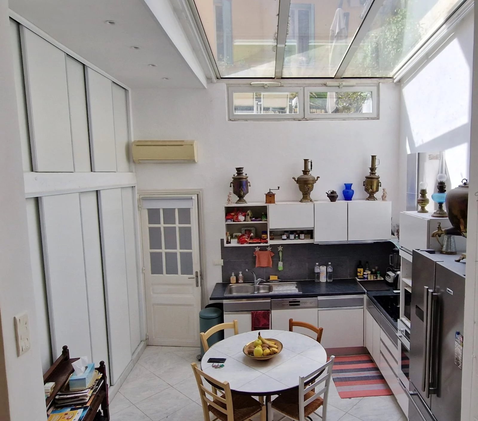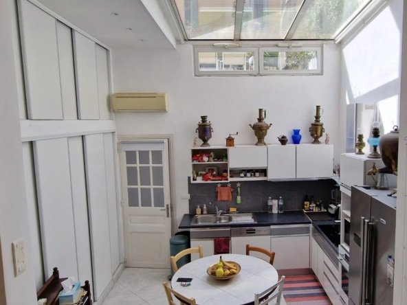L’intérieur de l’appartement principal se compose d’une grande cuisine équipée sous verrière équipée d’un pare soleil électrique, nombreux placards de rangements ; séparé par une jardinière intérieure vous accéder à la salle à manger/bibliothèque, puis au salon avec belle hauteur sous plafond, et enfin à l’espace nuit avec deux chambres lumineuses et très calmes, des toilettes séparés, une salle de bains avec baignoire et un espace buanderie/rangements.