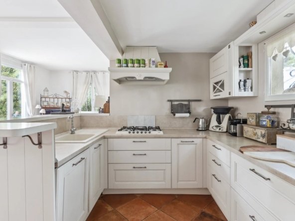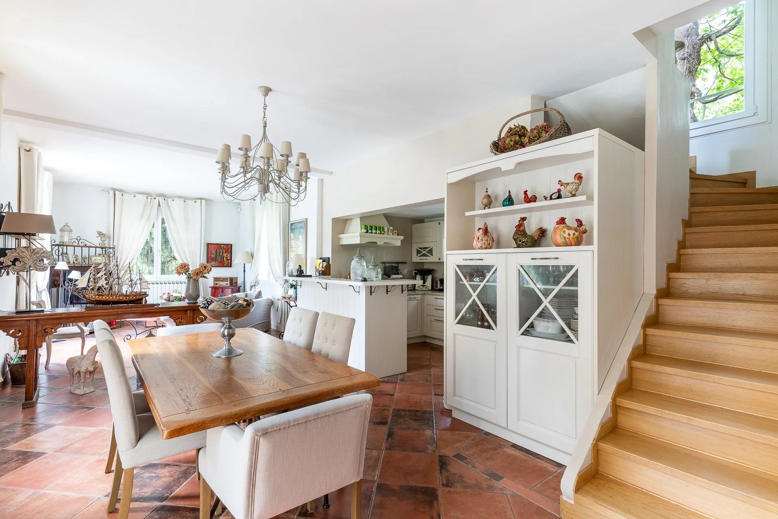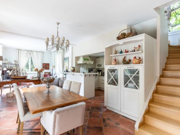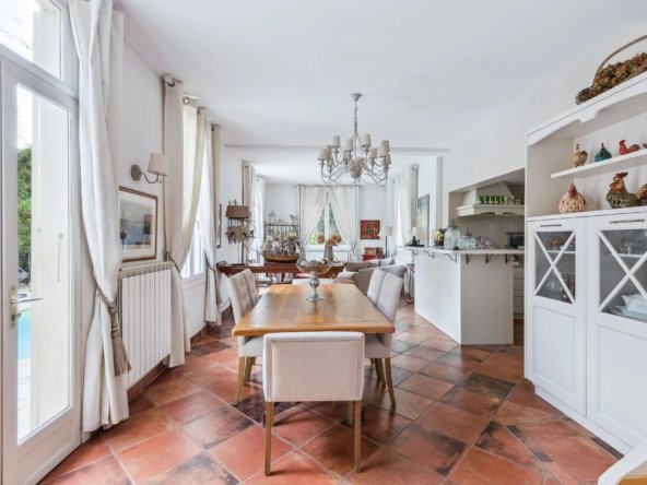 Un vaste séjour baigné de lumière avec cuisine ouverte , donnant sur la terrasse et la piscine