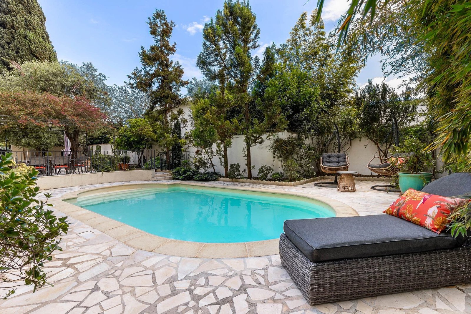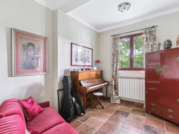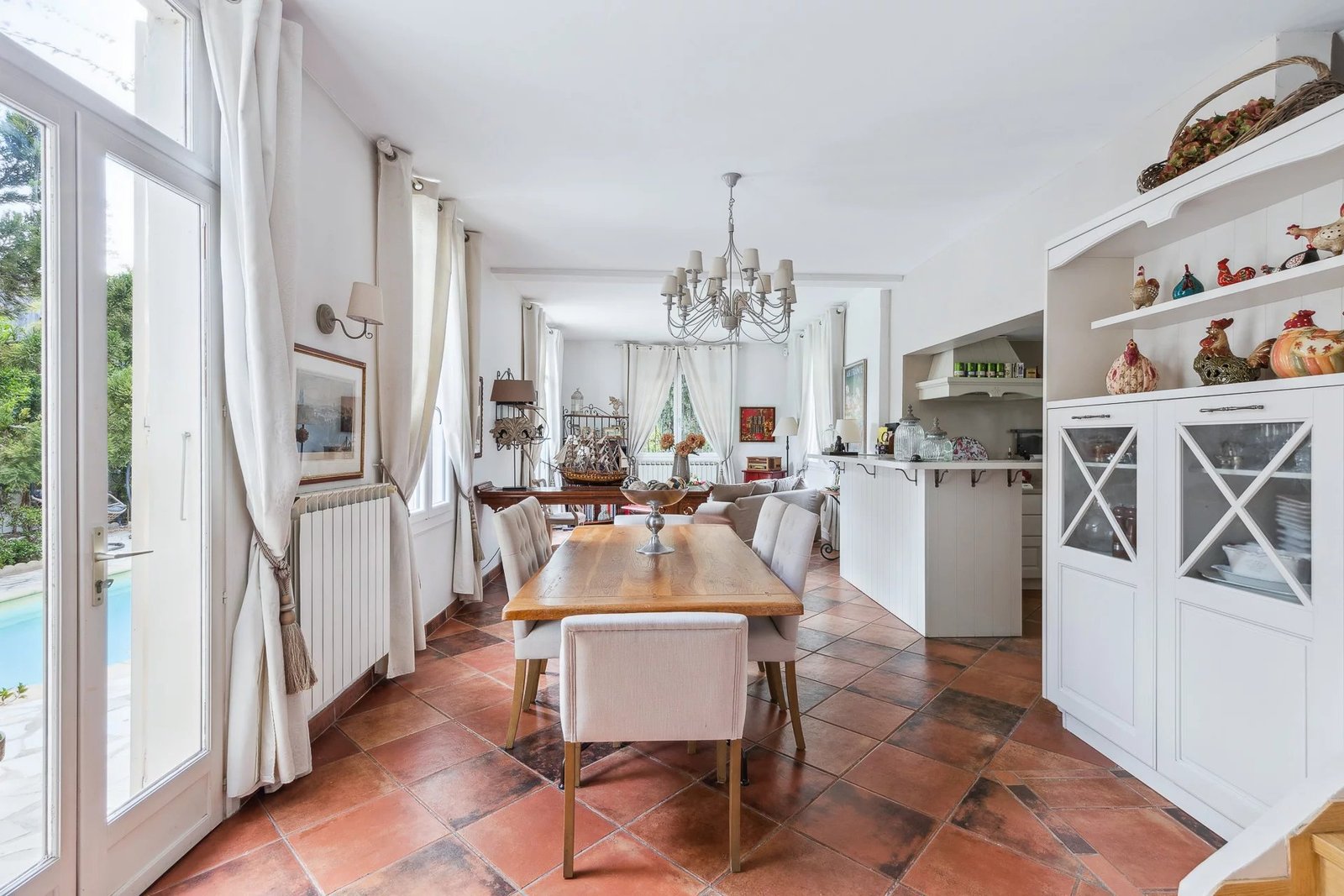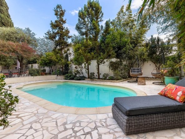 Édifiée sur un terrain arboré d’environ 477 m² , elle offre un bel espace de vie lumineux, orienté plein Sud , ouvrant sur la piscine et un agréable jardin agrémenté d’une tonnelle.