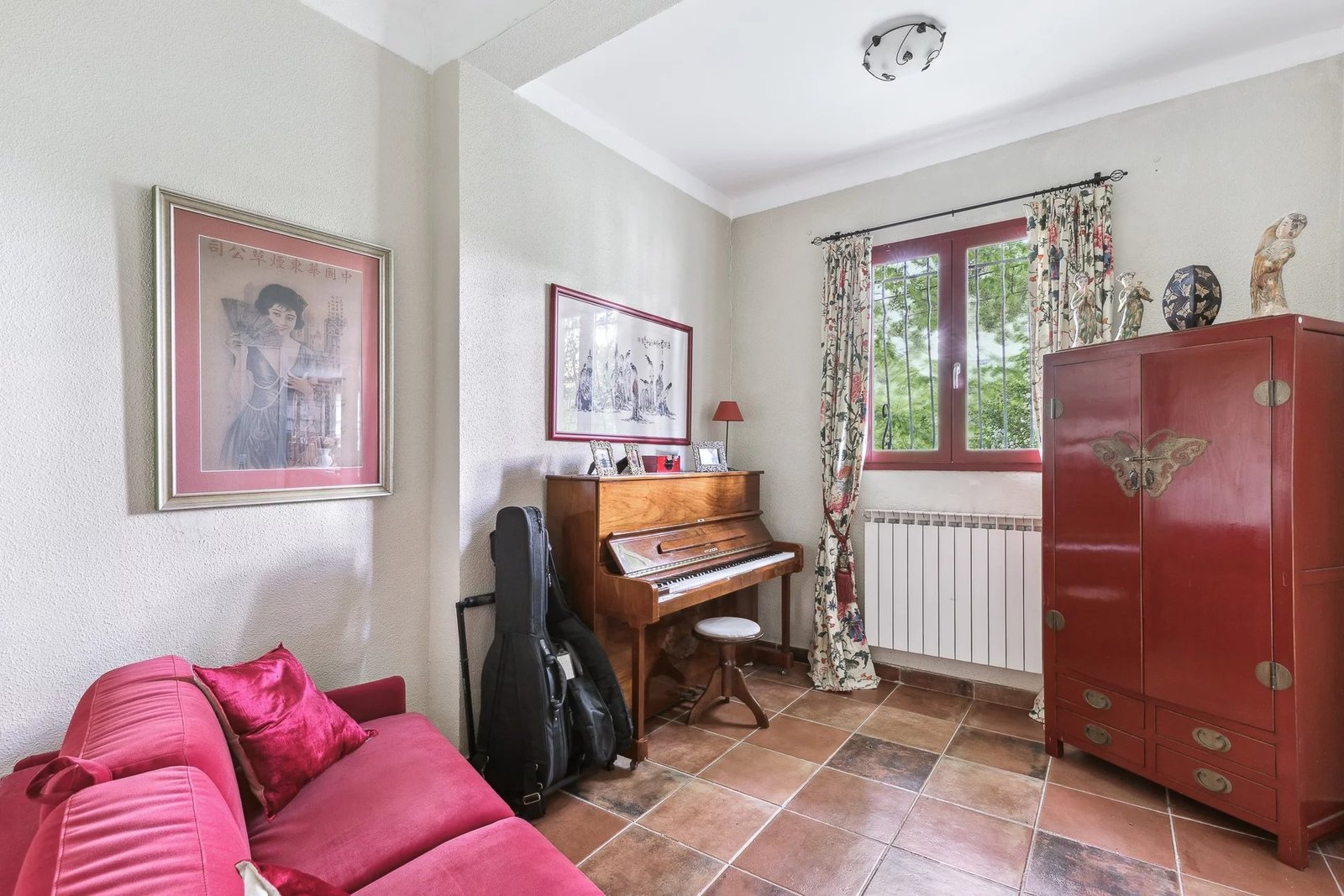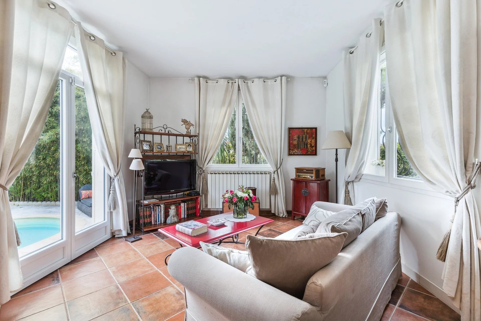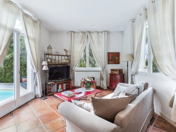 Le séjour offre une vue dégagée sur la verdure et la piscine, sans aucun vis-à-vis.