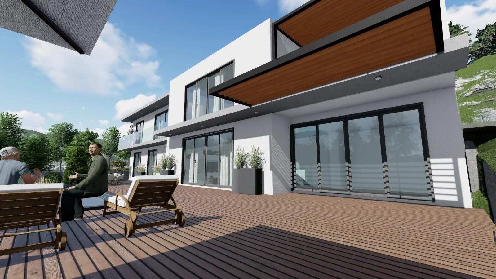 – Grande terrasse en travertin et pergola bioclimatique