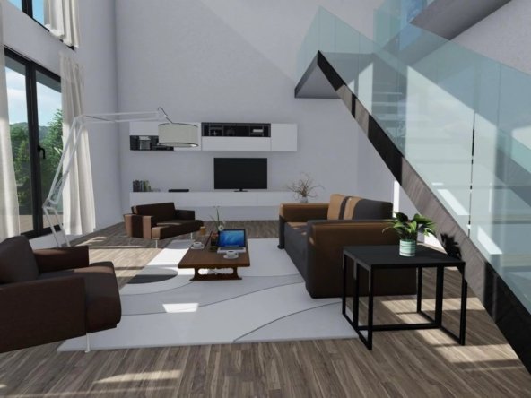 – Séjour lumineux avec escalier design mural
