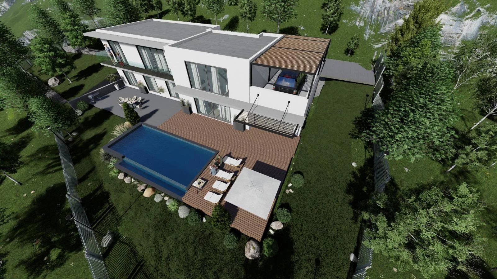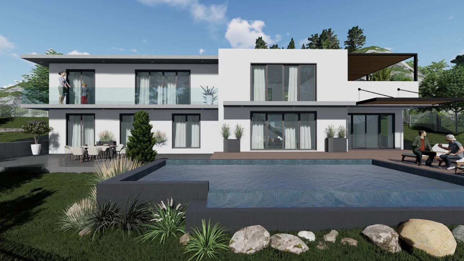 – Garde-corps aluminium, murs en pierres, cyprès et jardin d’ornement