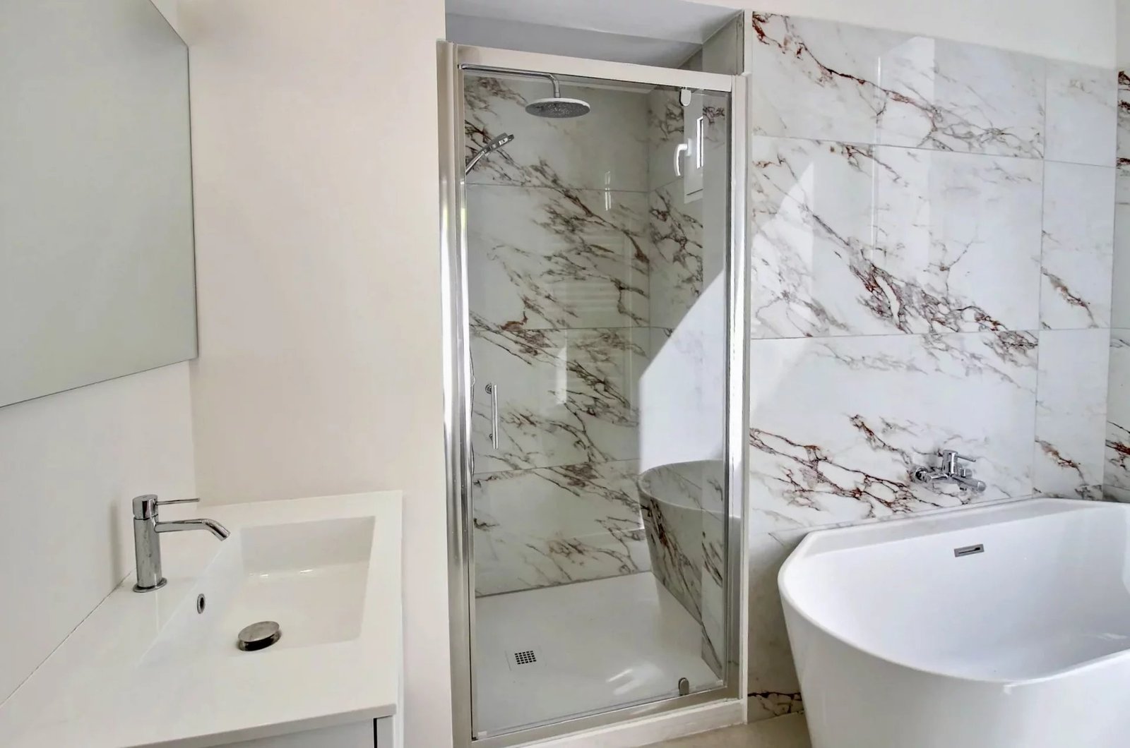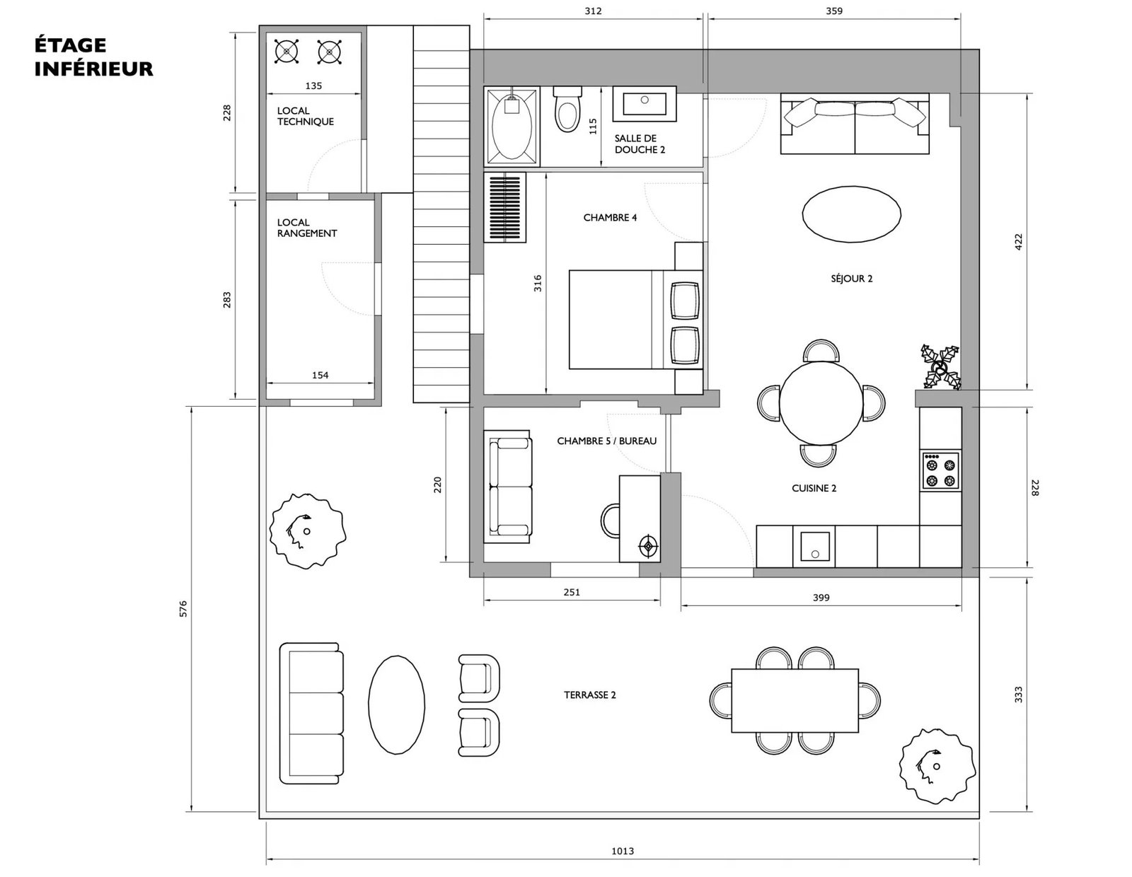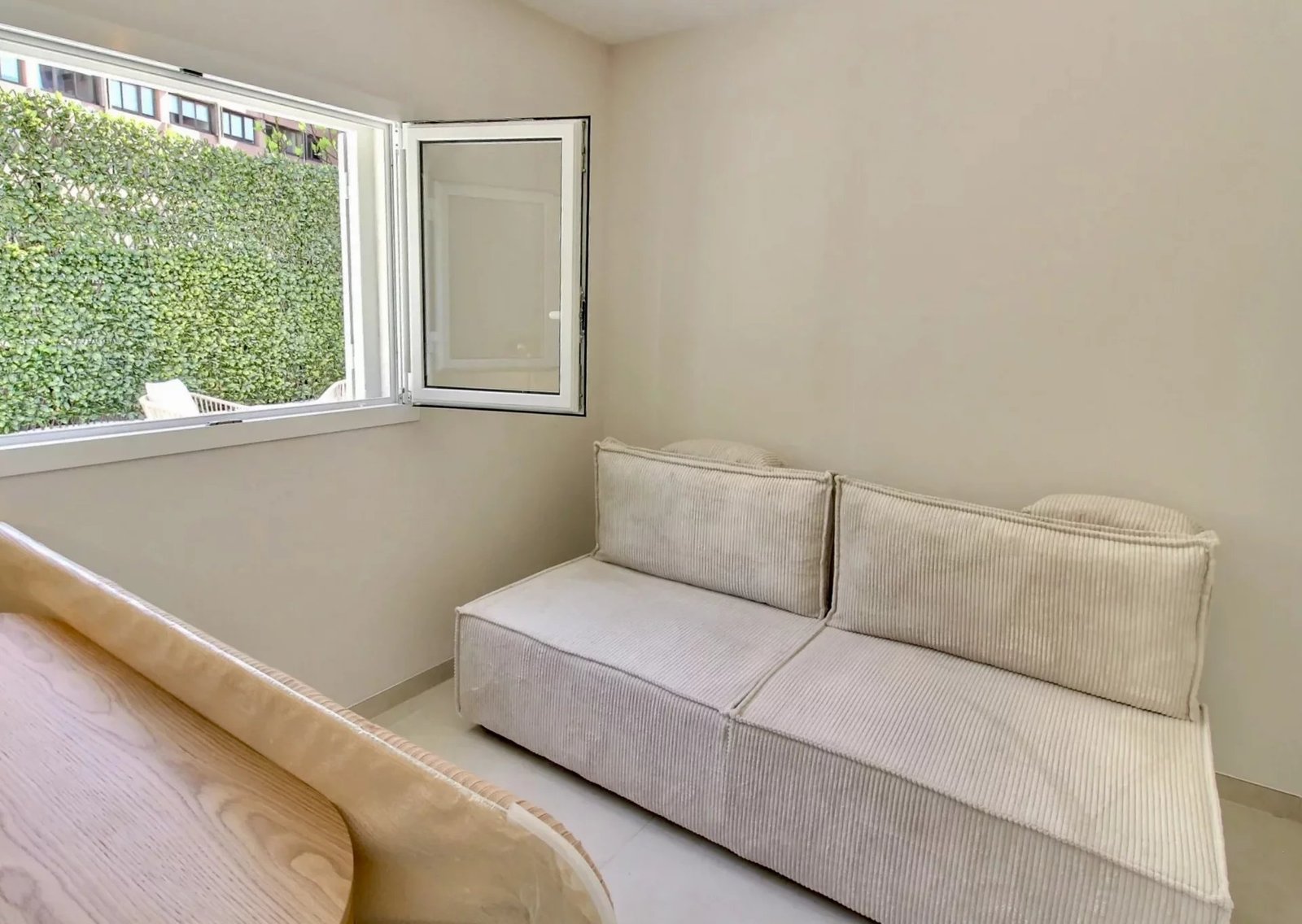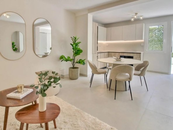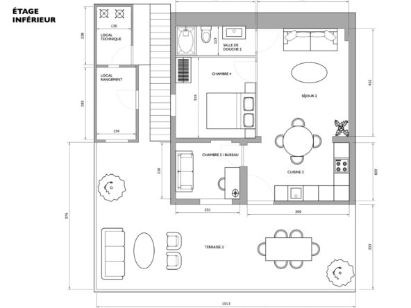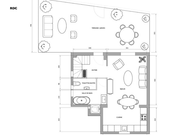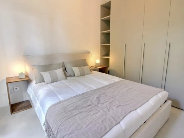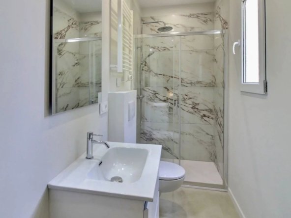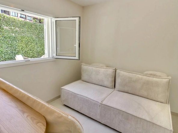 En rez-de-jardin, elle accueille un appartement style 3 Pièces indépendant de 46 m² avec séjour / cuisine ouverte équipée donnant sur une vaste terrasse de 33 m² à ciel ouvert, 2 chambres, salle de douches et toilettes.