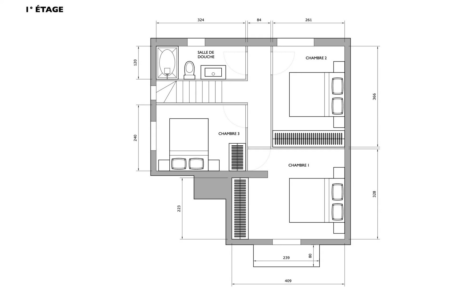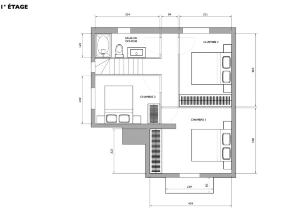 À l’étage, elle dispose d’un espace nuit avec trois chambres dotées de penderies sur mesure et une salle d’eau avec toilettes.