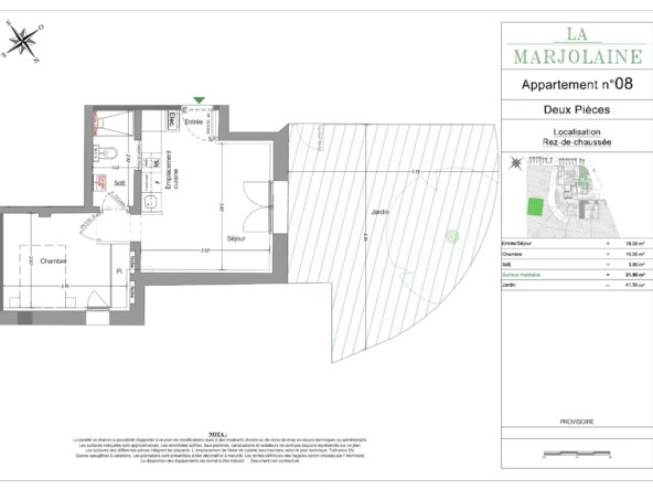 L’appartement offre un séjour avec cuisine ouverte entièrement équipée donnant sur un jardin paysager privé d’environ 41 m², une chambre avec placard intégré, ainsi qu’une salle de douche avec WC, le tout réalisé avec un soin extrême du détail pensé pour optimiser l’espace, la luminosité et le confort.