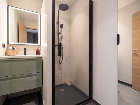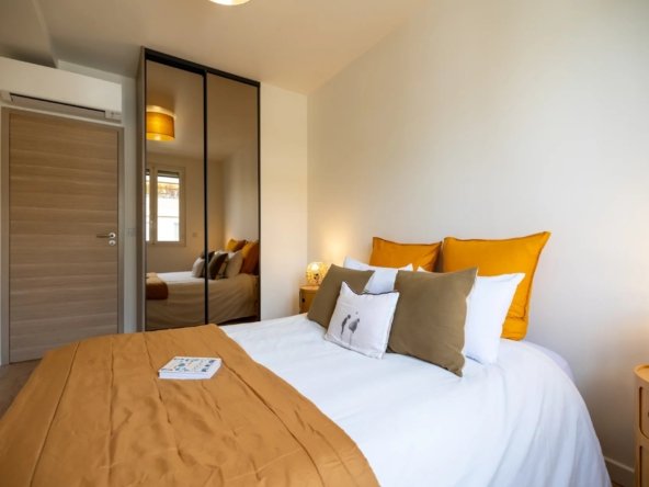 Situé en étage élevé, il offre une vue panoramique sur la mer et la ville. Il se compose d’une pièce de vie avec cuisine équipée haut de gamme, 3 chambres avec placards, 2 salles de douche et 2 toilettes séparées.