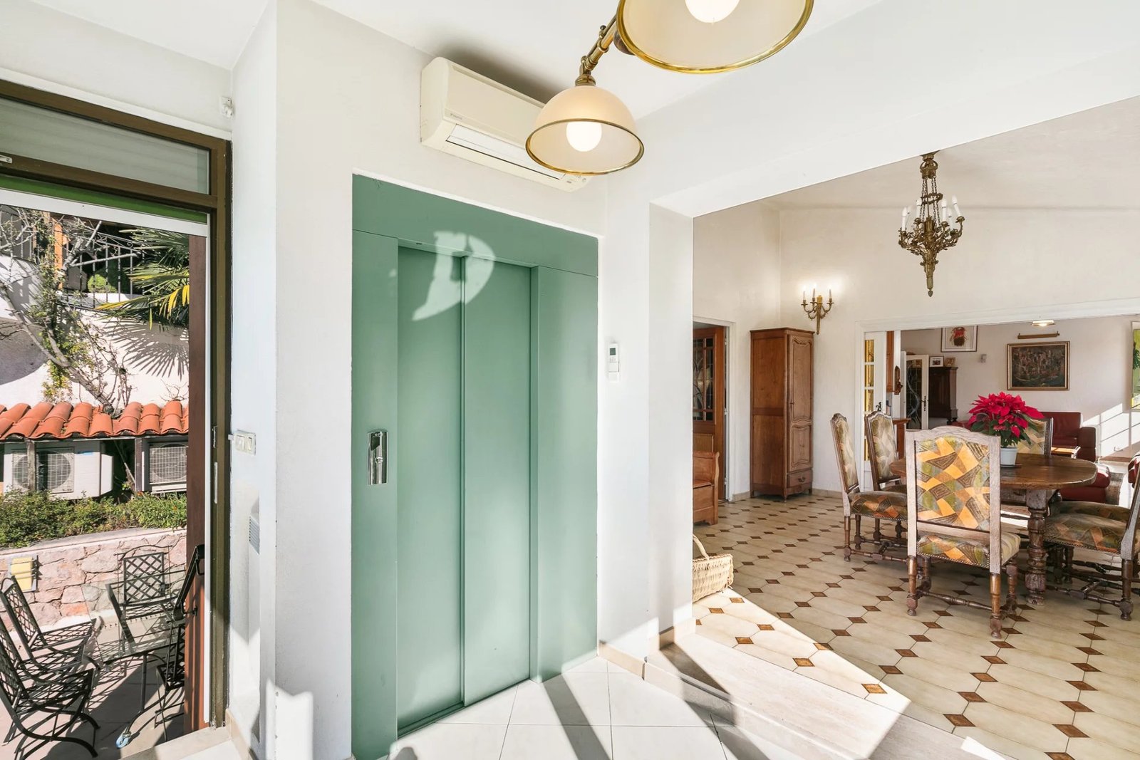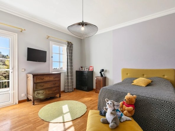 Édifiée sur un terrain de plus de 5 000 m², la maison principale offre 14 pièces dont 9 chambres, permettant d’accueillir famille et invités dans un grand confort de volumes. Un ascenseur dessert tous les niveaux, assurant praticité et confort au quotidien.