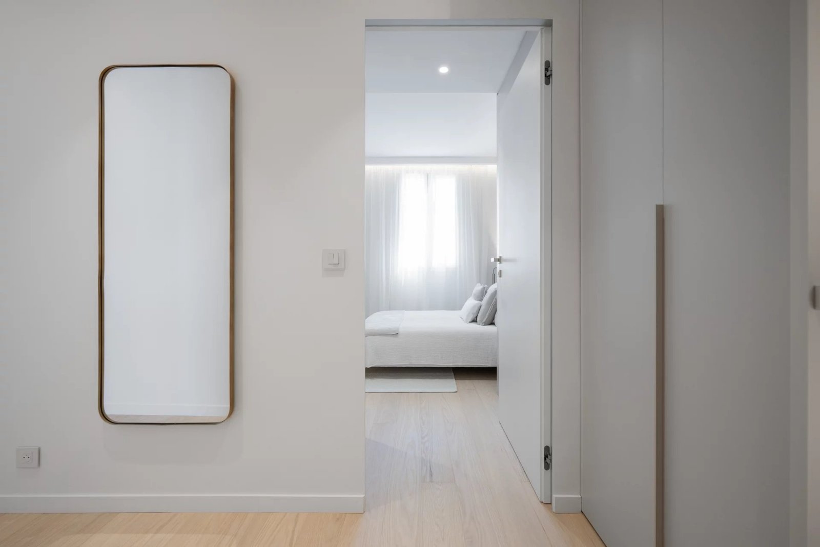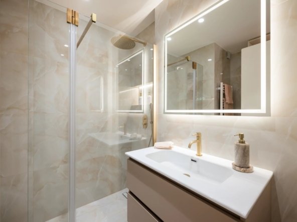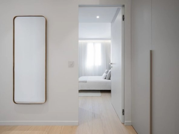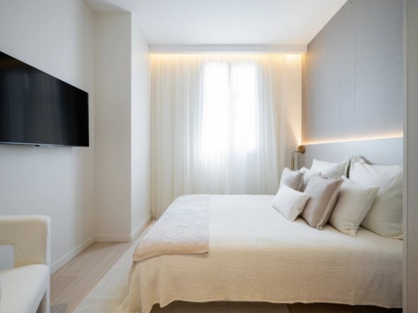 La chambre, calme et fonctionnelle, dispose de rangements sur mesure. Une salle de douche à l’italienne et des WC indépendants complètent l’appartement. Parquet en chêne massif, climatisation réversible et finitions de qualité viennent parfaire l’ensemble.