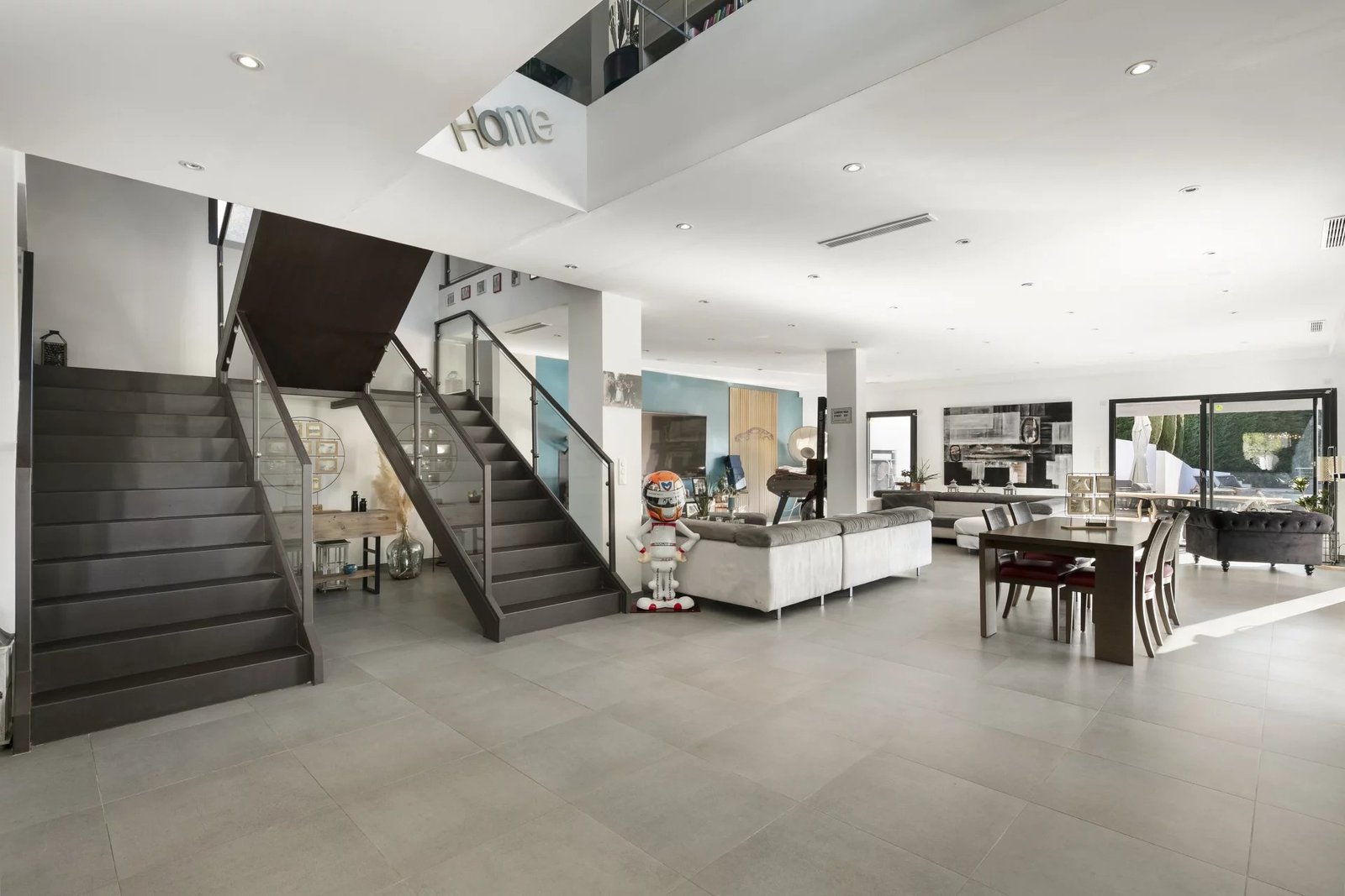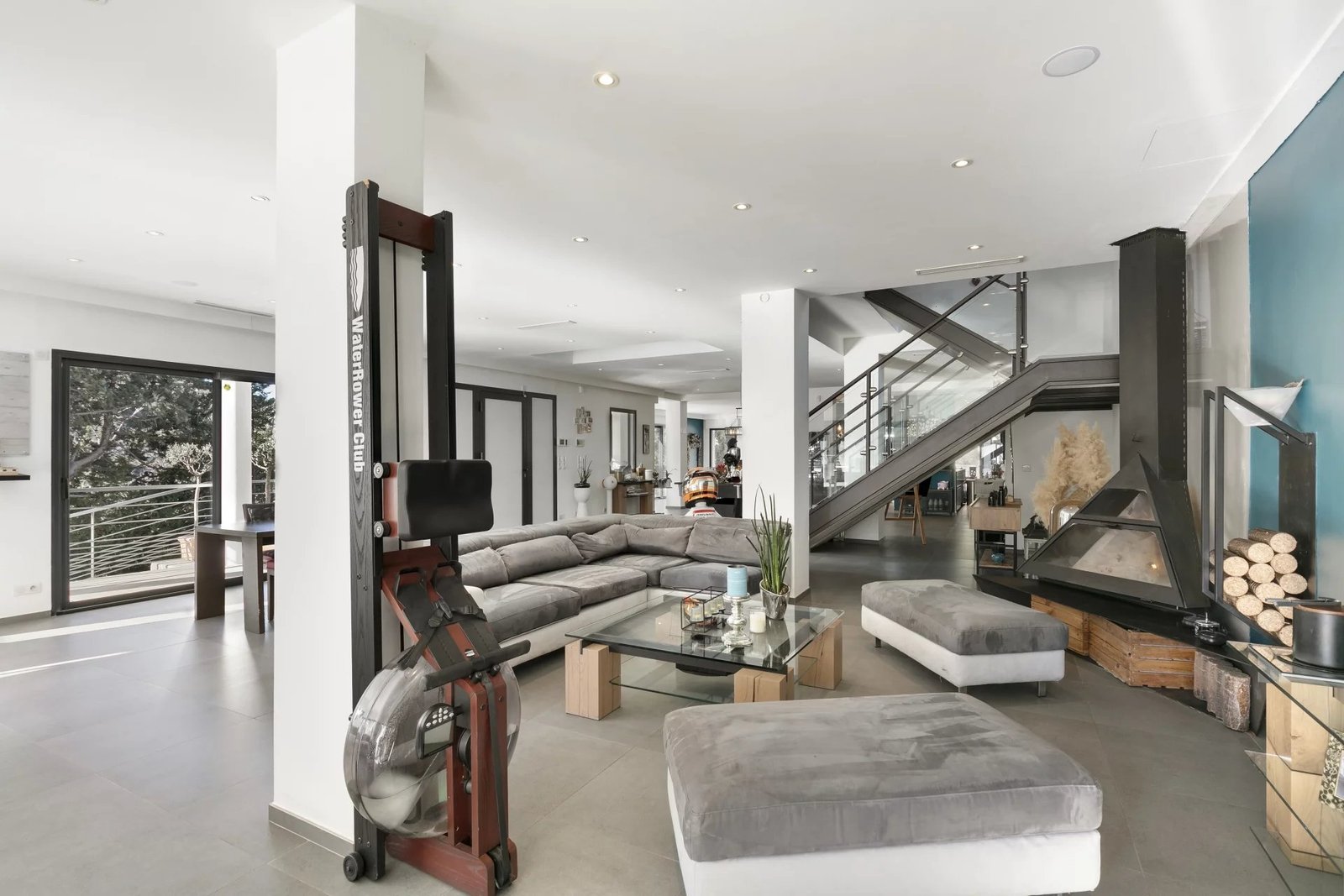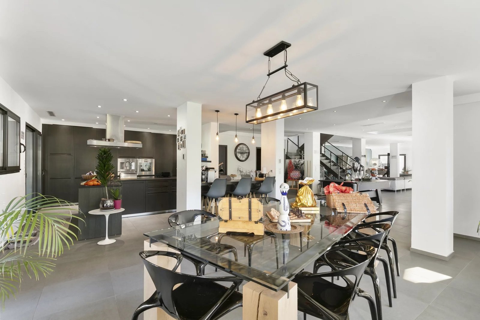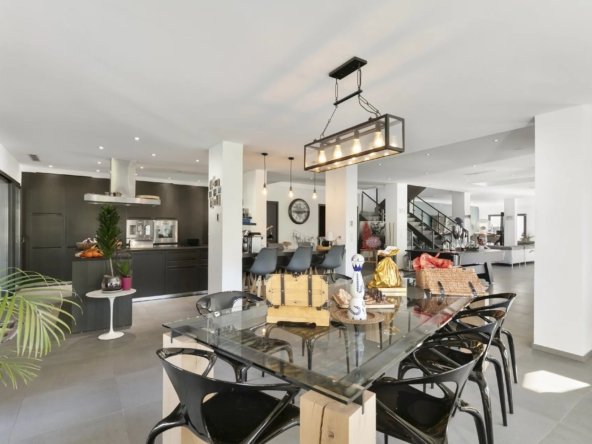 Les espaces de vie offrent 161 m² de réception comprenant salon, salle à manger et cuisine moderne entièrement équipée, baignés de lumière et ouverts sur les extérieurs.