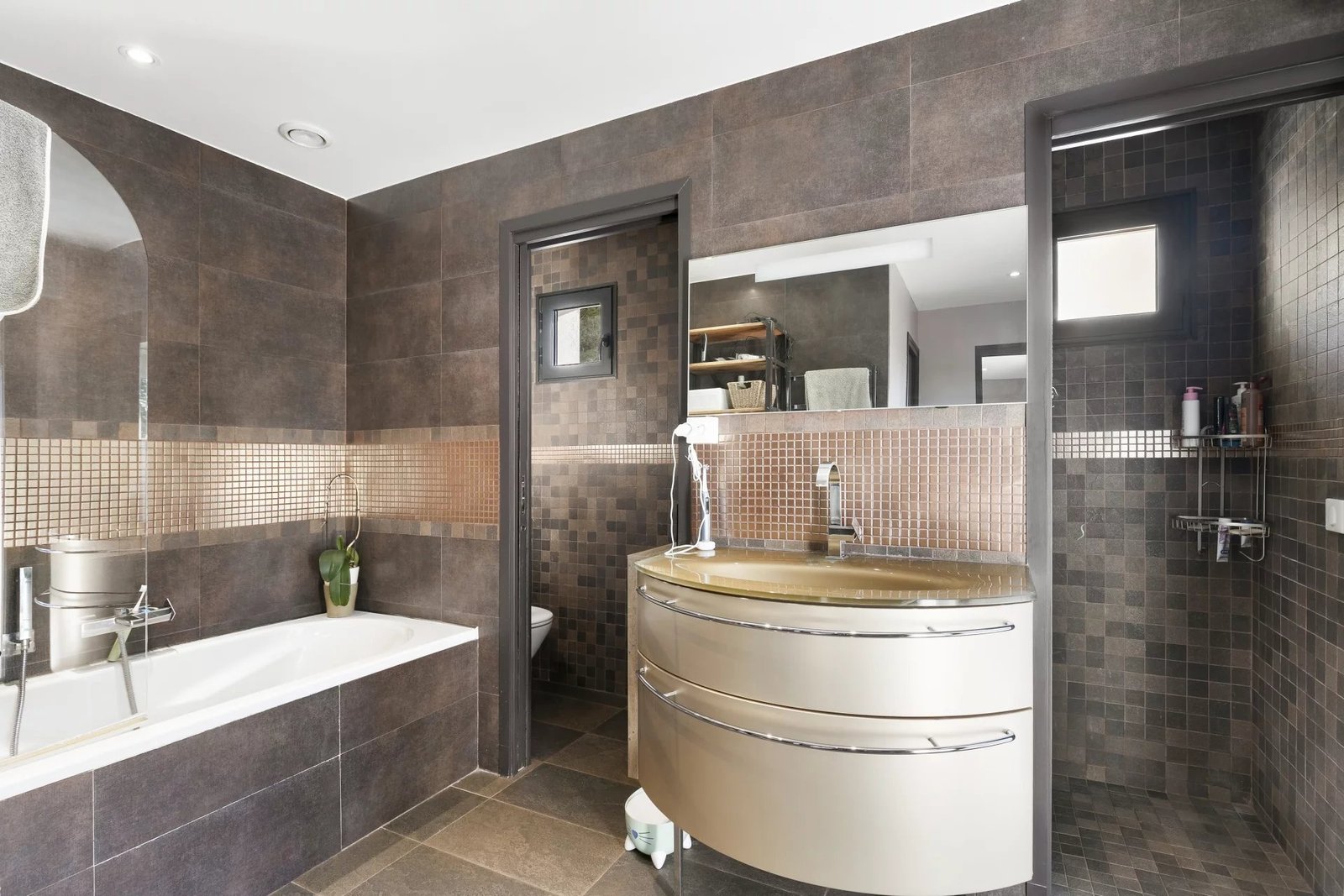 À l’extérieur, vous profiterez d’un jardin plat paysagé, d’une piscine chauffée, d’une grande terrasse, d’un terrain de pétanque, de panneaux solaires et d’un arrosage automatique.