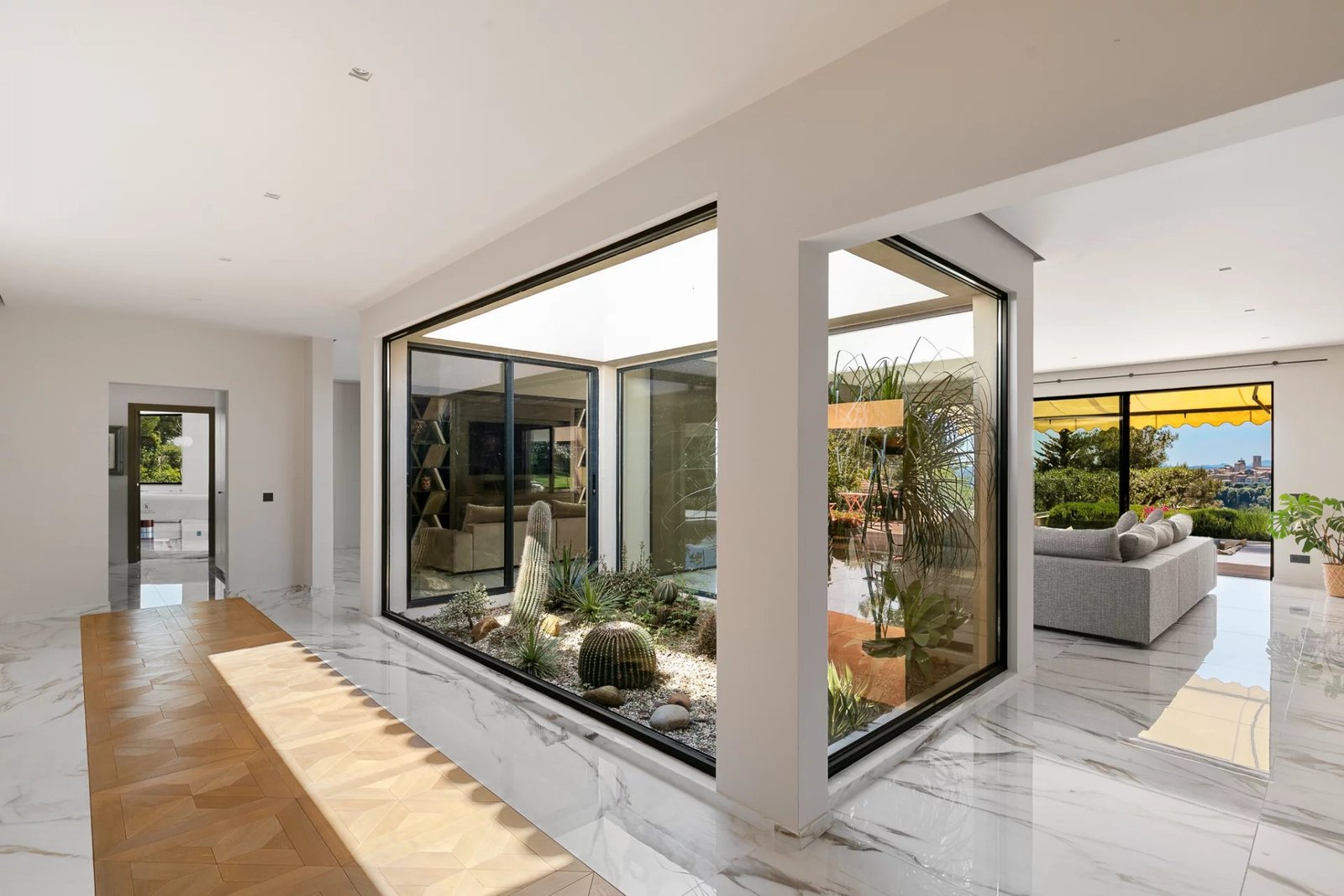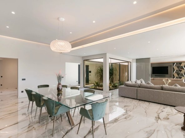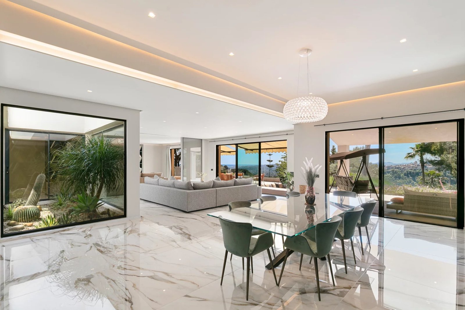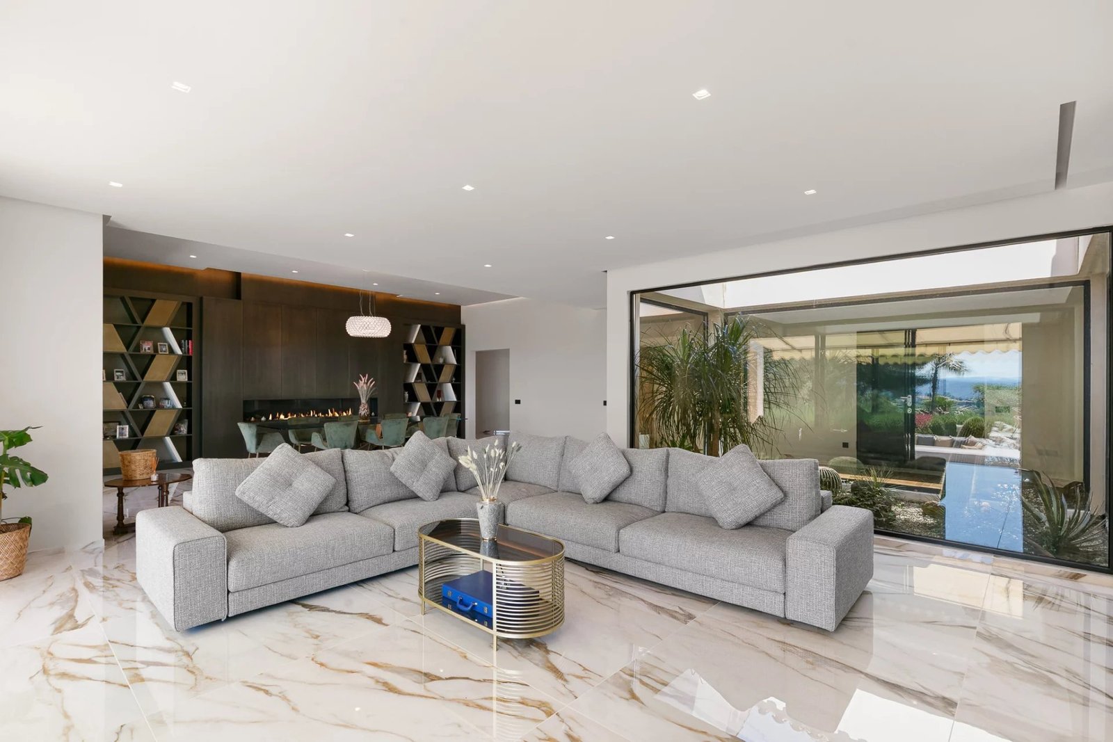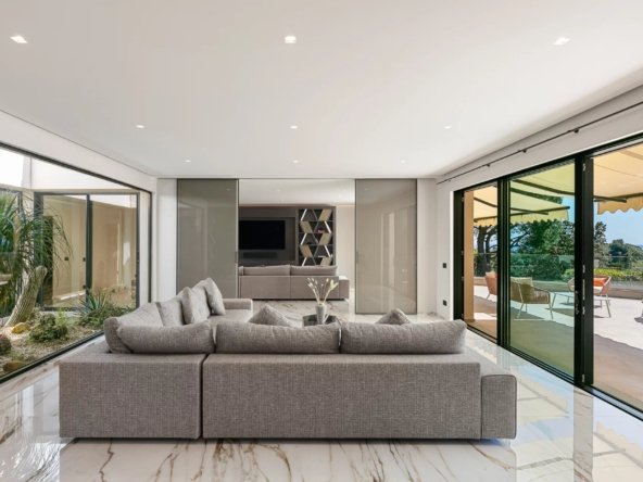 Le salon principal, baigné de lumière grâce à ses ouvertures sur toute hauteur, s’organise autour d’un jardin zen intérieur et offre un spectacle quotidien sur les paysages environnants. Ce vaste espace de réception se prolonge naturellement vers une terrasse panoramique, idéale pour des moments en plein air inoubliables.