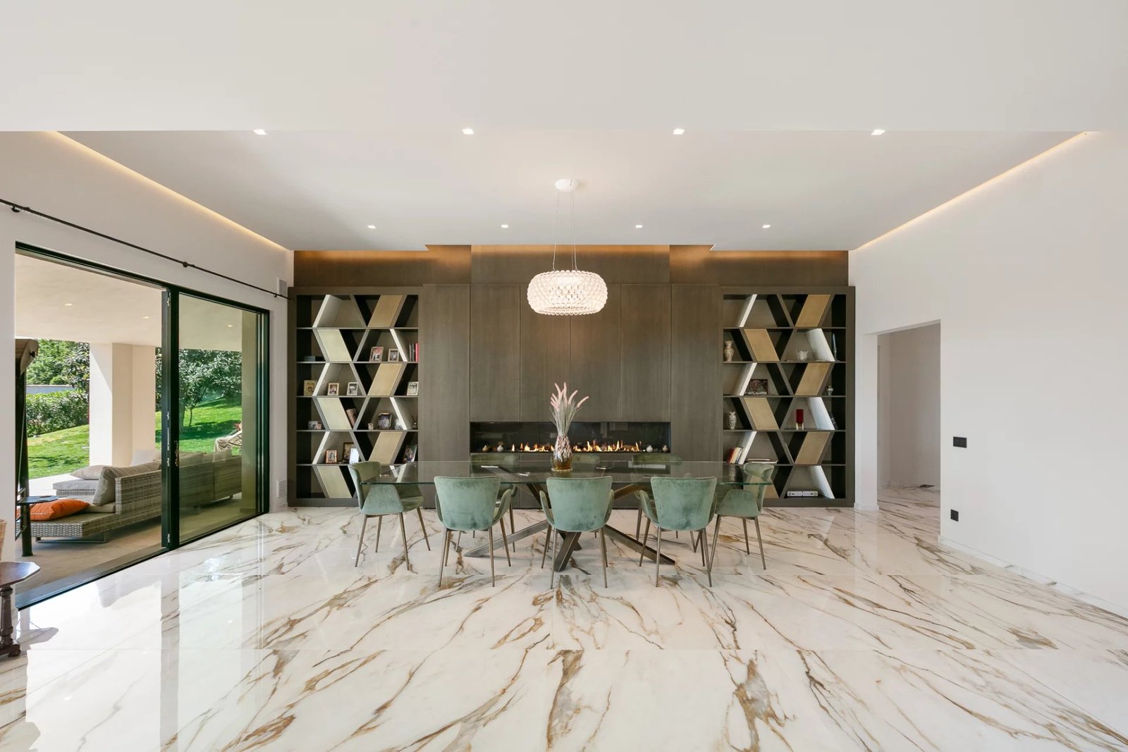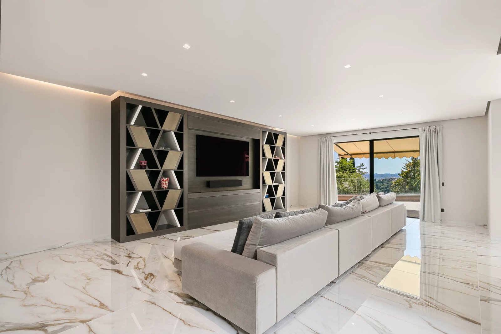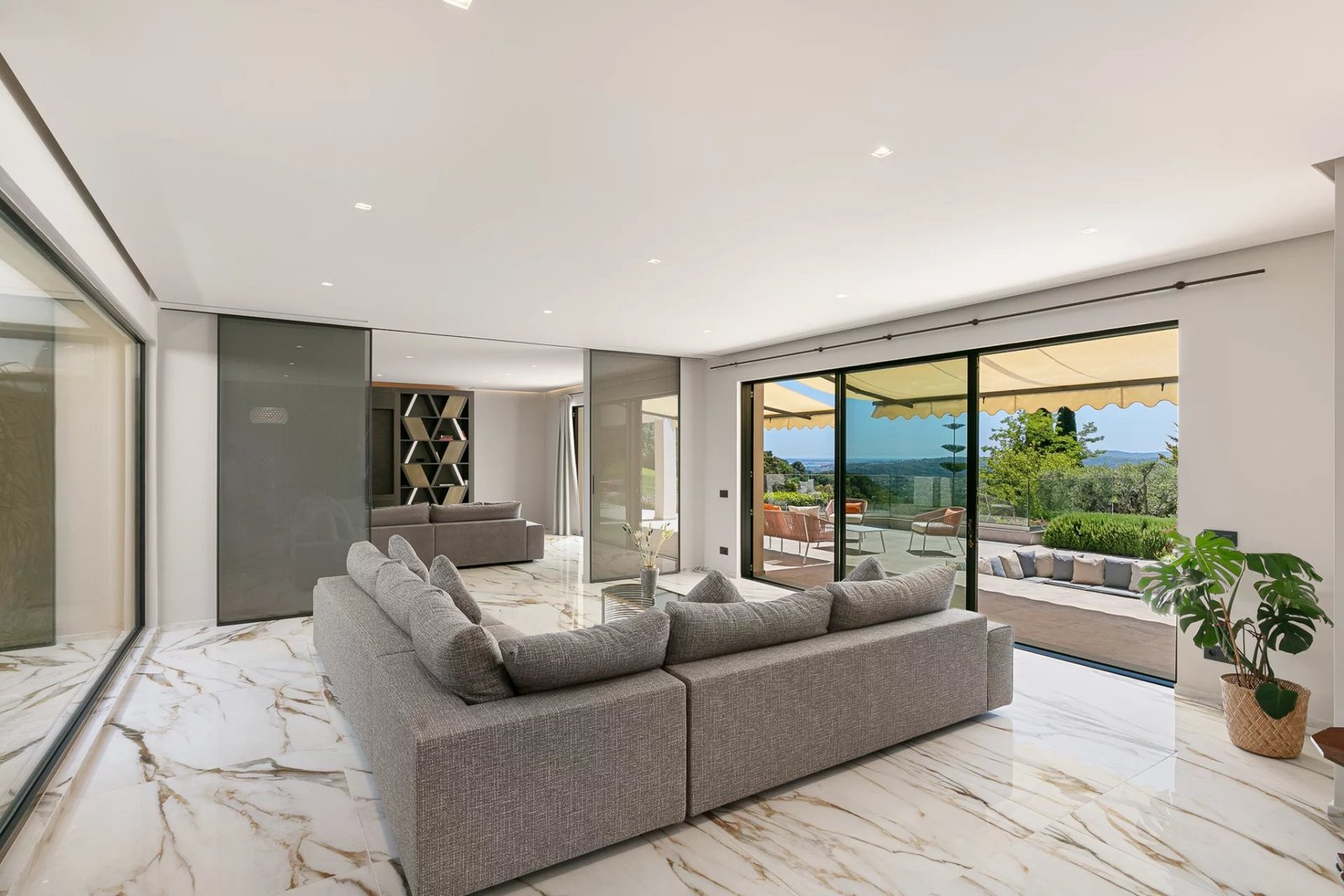 Le salon principal, baigné de lumière grâce à ses ouvertures sur toute hauteur, s’organise autour d’un jardin zen intérieur et offre un spectacle quotidien sur les paysages environnants. Ce vaste espace de réception se prolonge naturellement vers une terrasse panoramique, idéale pour des moments en plein air inoubliables.