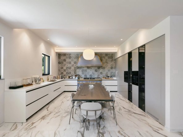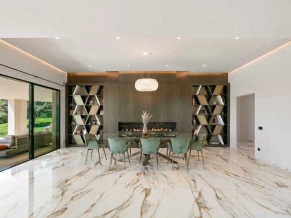 Une salle à manger élégante, un coin détente avec cheminée, ainsi qu’un salon de billard complètent cette ambiance chaleureuse. La cuisine, sobrement luxueuse, marie le marbre naturel à des équipements haut de gamme. Un cellier attenant permet un usage discret et fonctionnel.