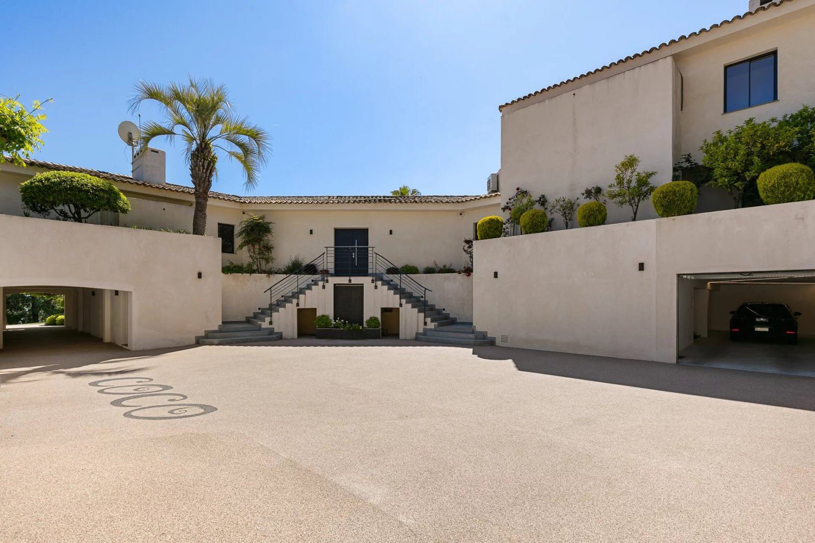 Dès l’arrivée, l’élégance s’impose : une vaste cour pavée avec fontaine accueille les visiteurs, menant à un garage de plus de 7 places. L’entrée principale, sobre et majestueuse, ouvre sur des volumes impressionnants et une architecture intérieure lumineuse, où chaque détail a été pensé avec soin.