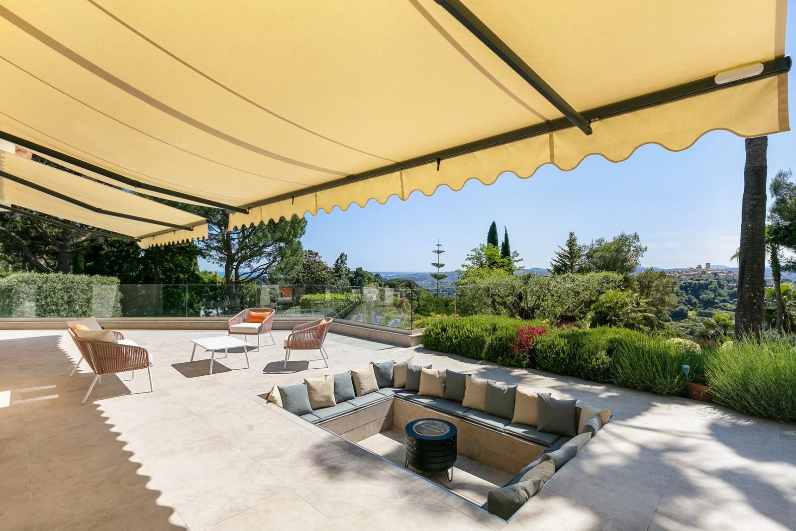 Le terrain de plus de 8 000 m², entièrement paysager, comprend un potager soigné, des restanques naturelles et de nombreuses essences méditerranéennes. L’ensemble bénéficie d’un ensoleillement optimal et d’un panorama inégalé.