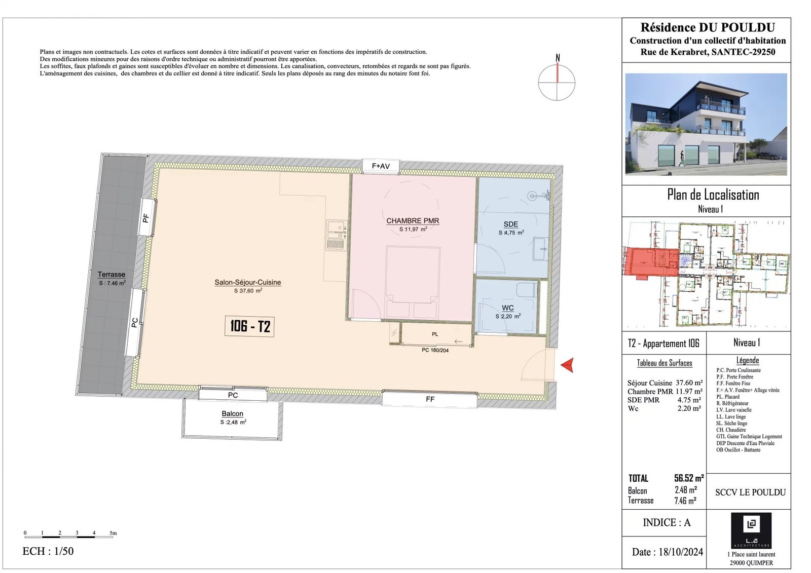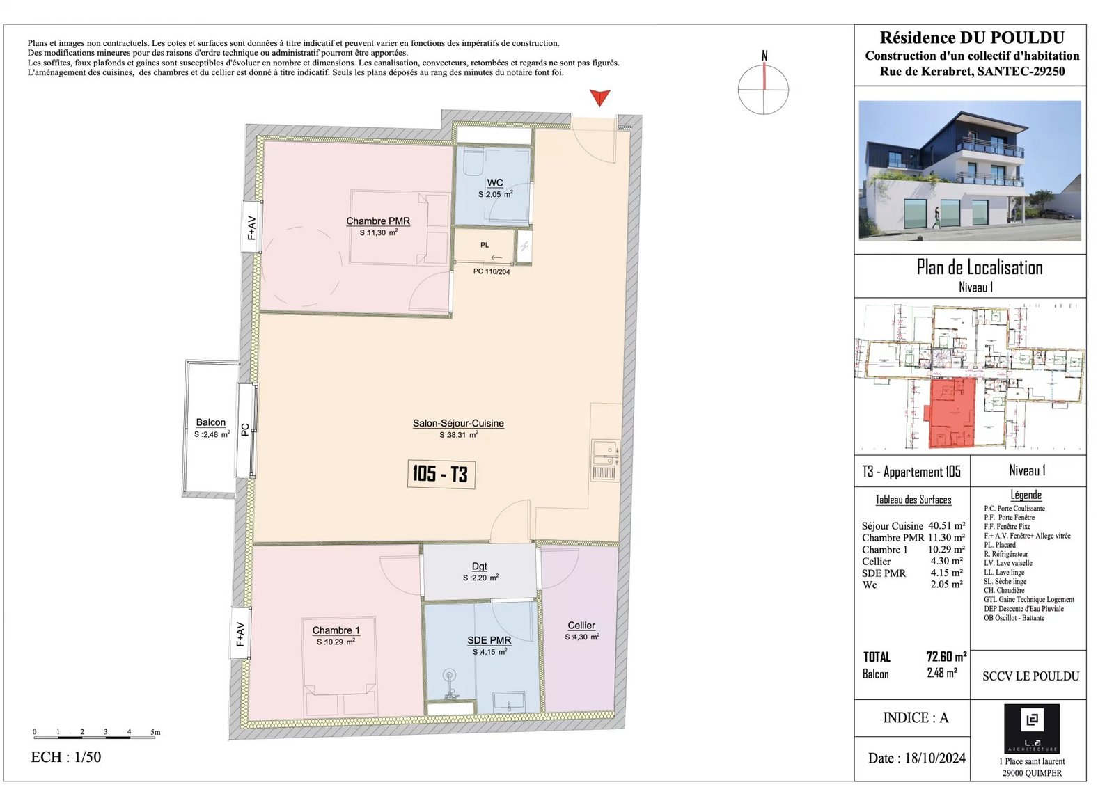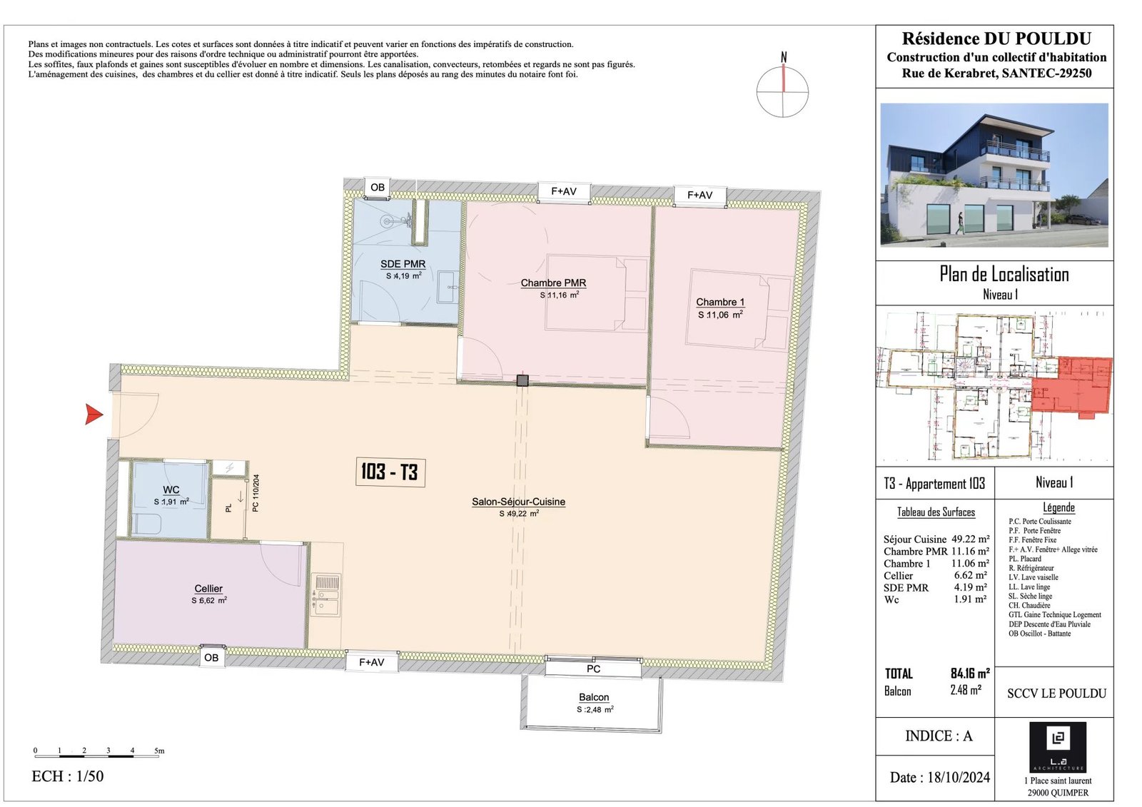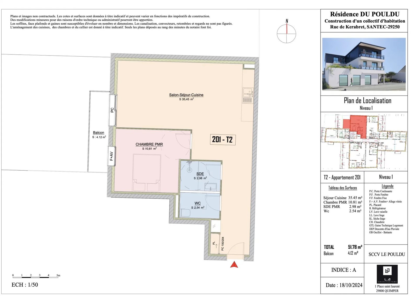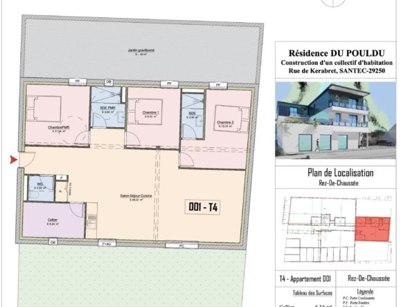 L’immeuble est implanté 45 rue de Kerabret à Santec, sur une parcelle de 873 m² cadastrée section AP n°13 et n°263, située en zone Uha du PLU. La conception privilégie la fonctionnalité et la durabilité : menuiseries aluminium à rupture de pont thermique avec volets roulants électriques, chaudières gaz à condensation individuelles, ventilation hygroréglable, isolation conforme aux normes en vigueur, ascenseur accessible PMR, parties communes soignées et stationnements matérialisés.