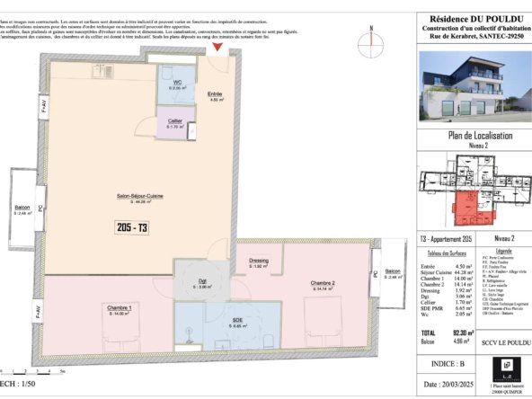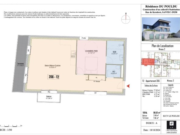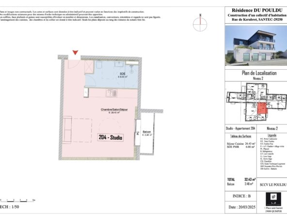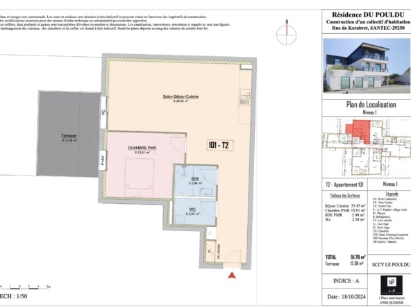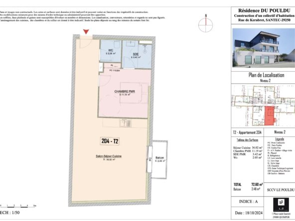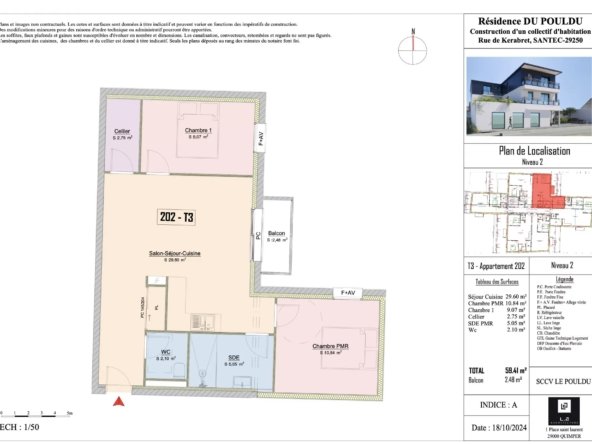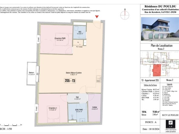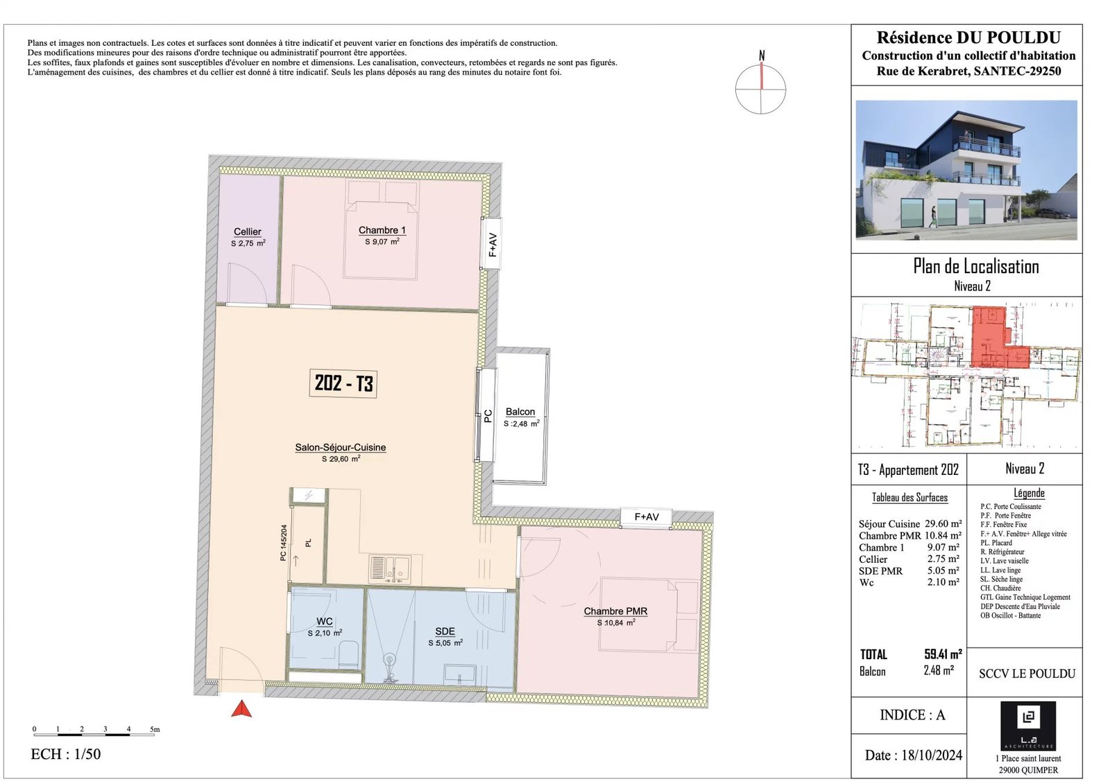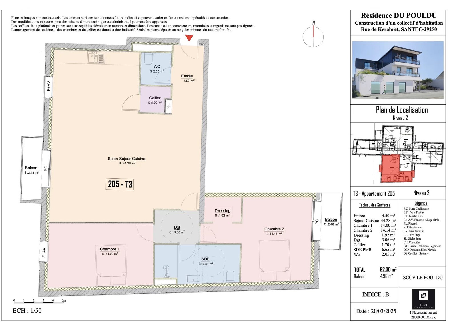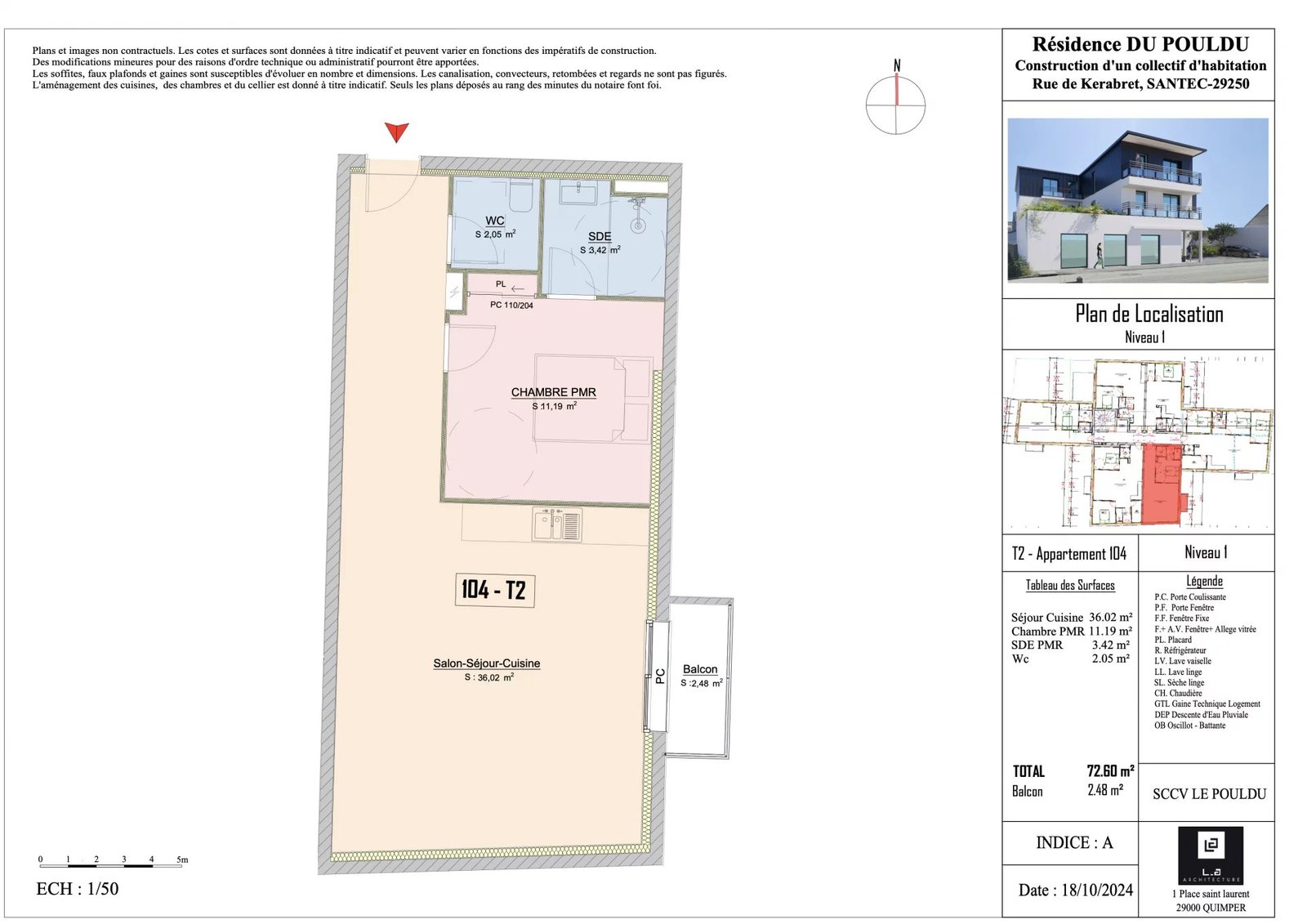 L’immeuble est implanté 45 rue de Kerabret à Santec, sur une parcelle de 873 m² cadastrée section AP n°13 et n°263, située en zone Uha du PLU. La conception privilégie la fonctionnalité et la durabilité : menuiseries aluminium à rupture de pont thermique avec volets roulants électriques, chaudières gaz à condensation individuelles, ventilation hygroréglable, isolation conforme aux normes en vigueur, ascenseur accessible PMR, parties communes soignées et stationnements matérialisés.