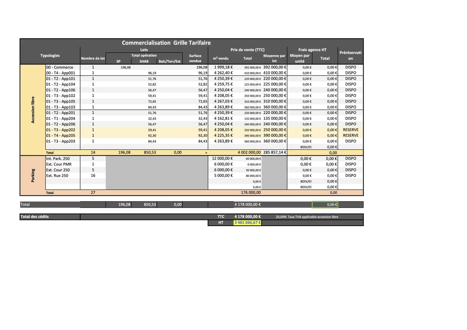 La vente est réalisée en l’état futur d’achèvement (VEFA) avec garanties légales (garantie de parfait achèvement, garantie décennale, assurance dommages-ouvrage), permettant à l’acquéreur de sécuriser son investissement et de maîtriser ses charges, sans aléas de gros travaux à court terme. Le prix global TTC de l’opération, parkings compris, est fixé par le promoteur à 4 178 000 € TTC (TVA 20 % – accession libre).