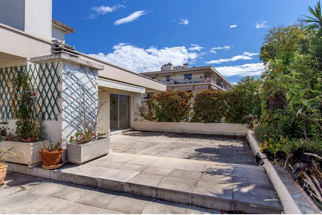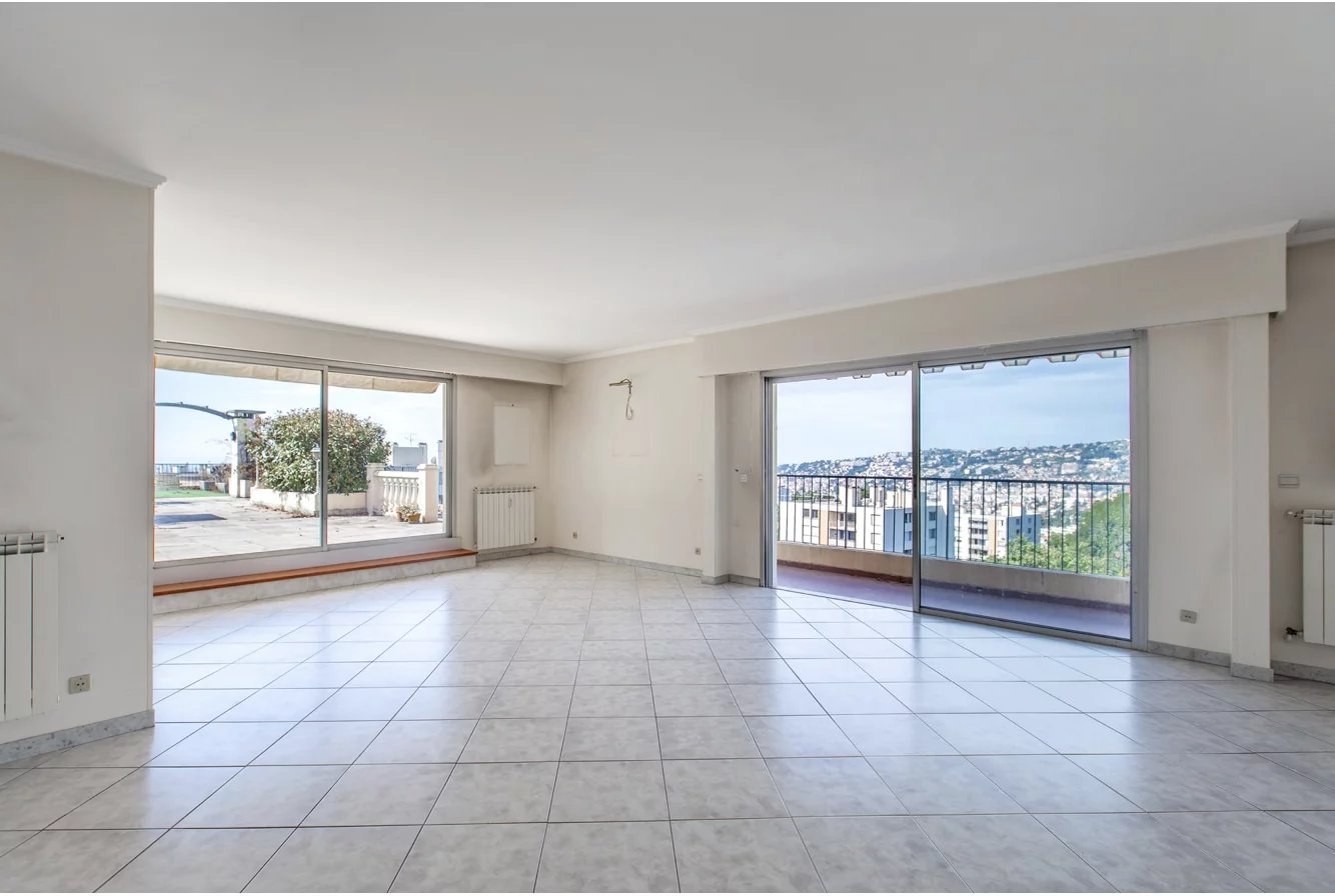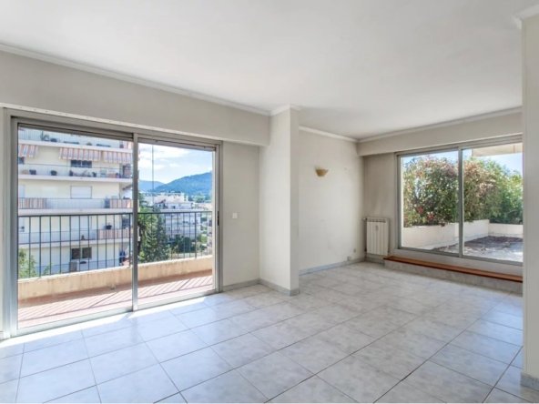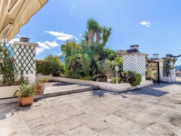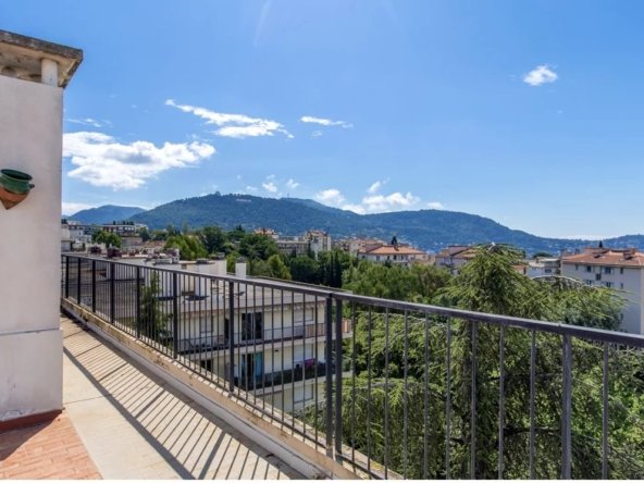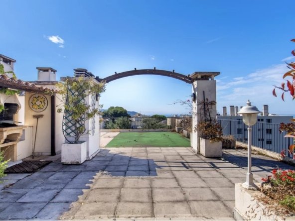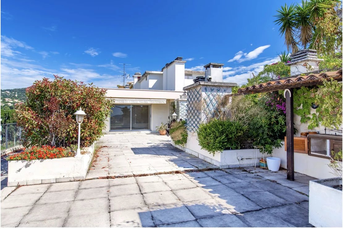 L’appartement s’ouvre sur une terrasse de plain-pied hors norme de 380 m², aménagée comme un véritable jardin suspendu, avec plantations, espaces de détente, barbecue et rangements. Ce lieu unique offre une vue dégagée et spectaculaire sur les collines, la ville, la mer et jusqu’au Cap d’Antibes.