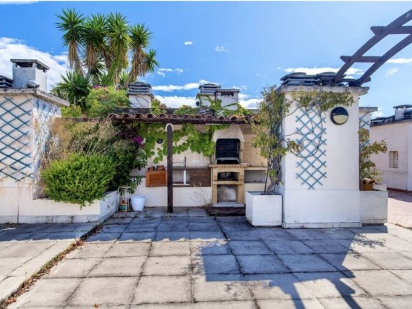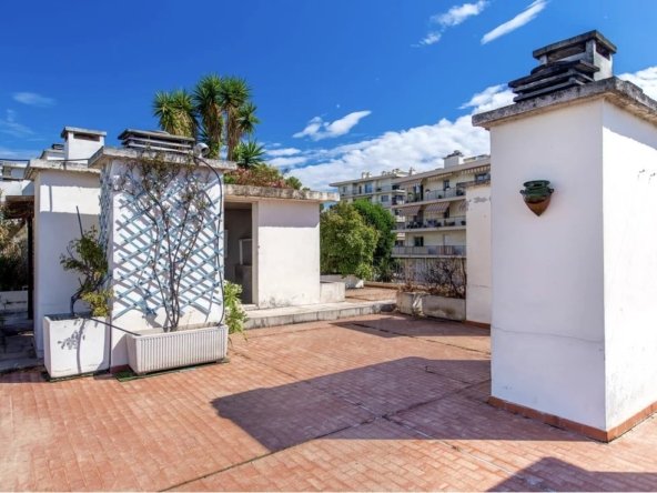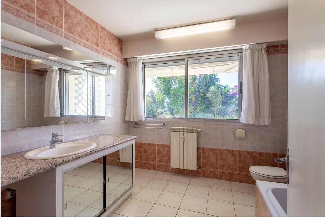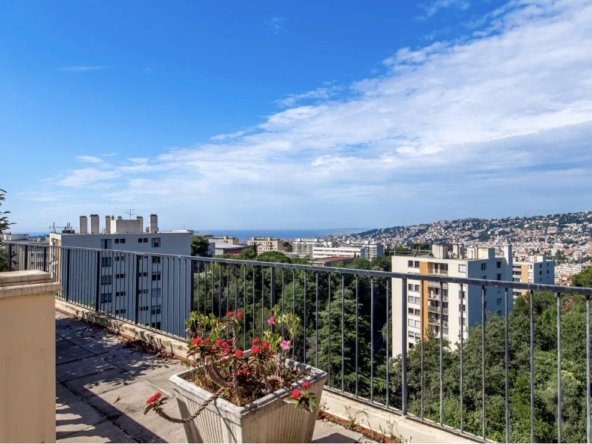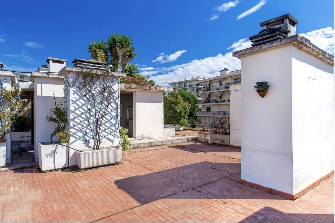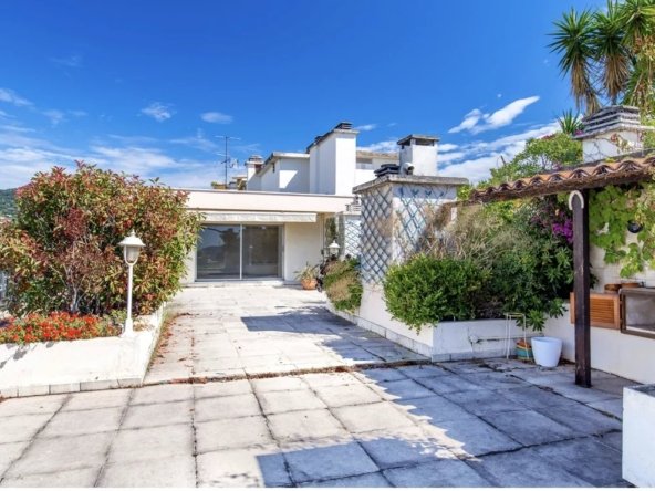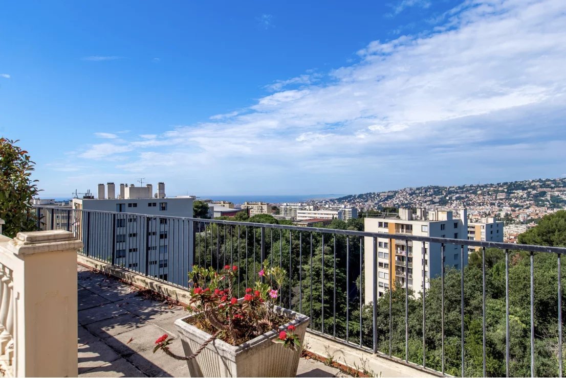 L’appartement s’ouvre sur une terrasse de plain-pied hors norme de 380 m², aménagée comme un véritable jardin suspendu, avec plantations, espaces de détente, barbecue et rangements. Ce lieu unique offre une vue dégagée et spectaculaire sur les collines, la ville, la mer et jusqu’au Cap d’Antibes.