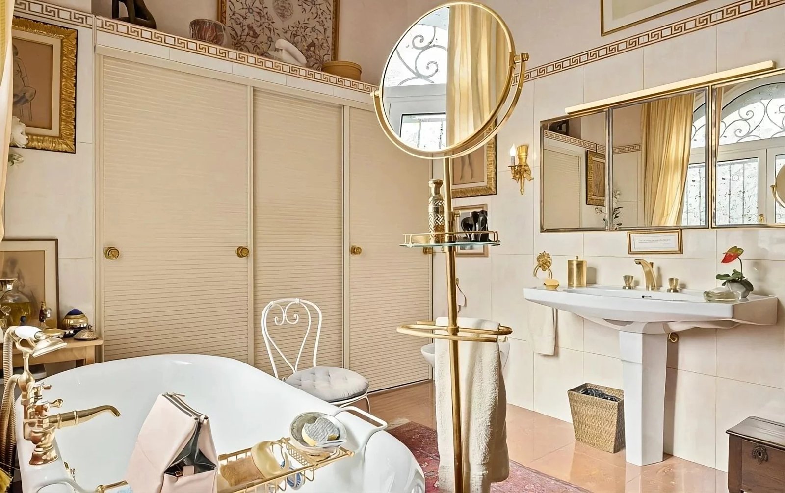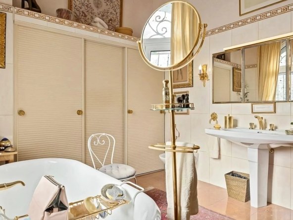 La villa est également agrémentée de deux dépendances et d’un garage, apportant un confort supplémentaire. Les matériaux de qualité, tels que le marbre et les mosaïques, allient élégance et raffinement.