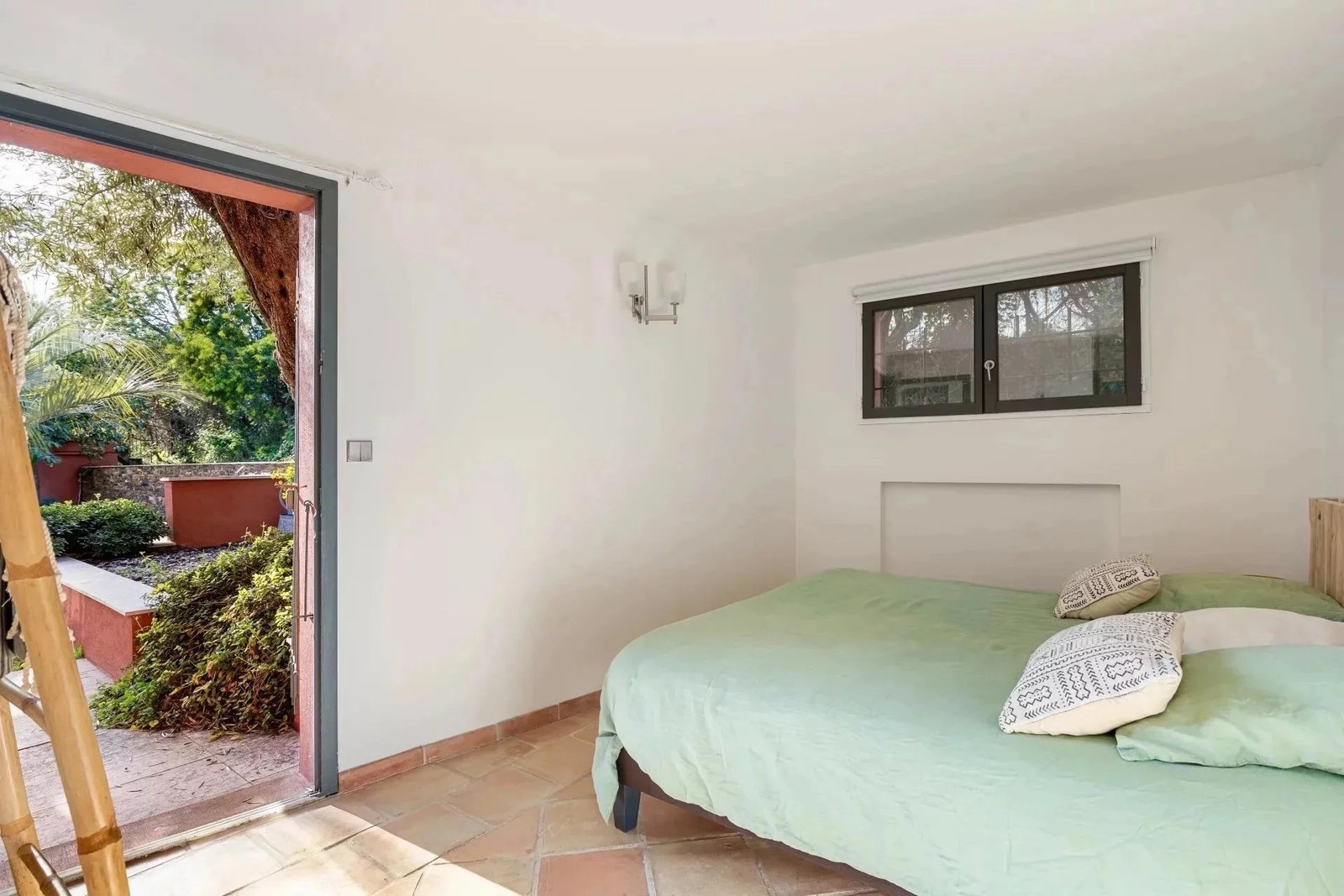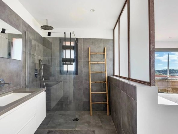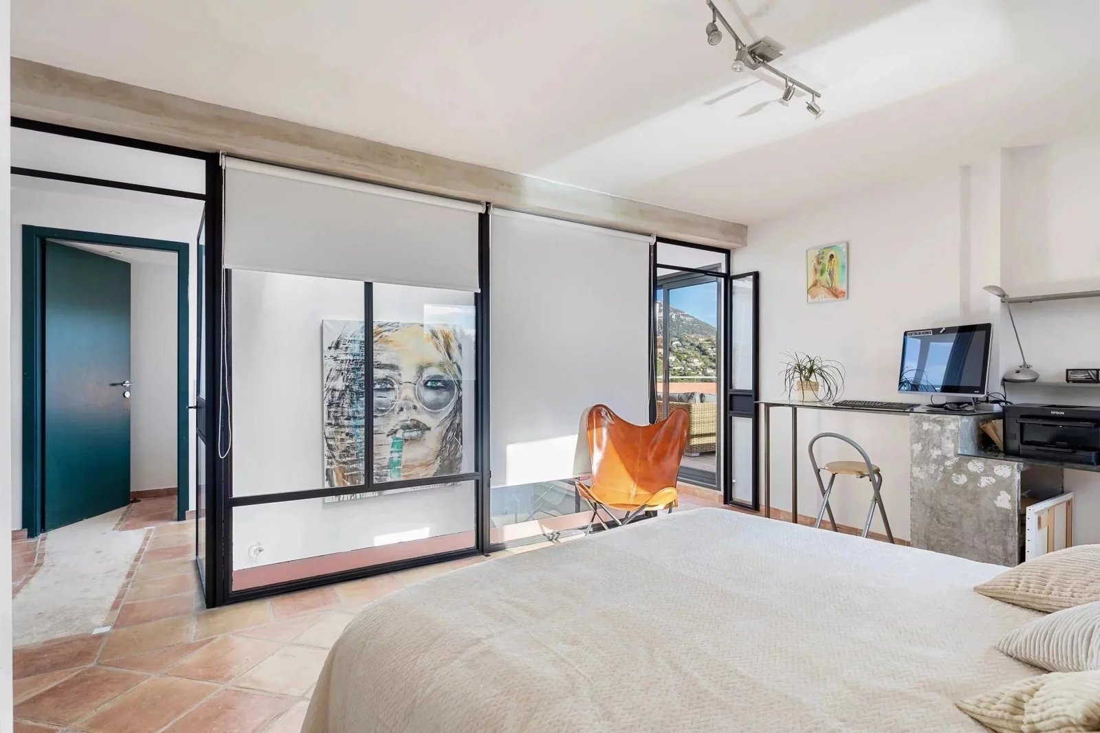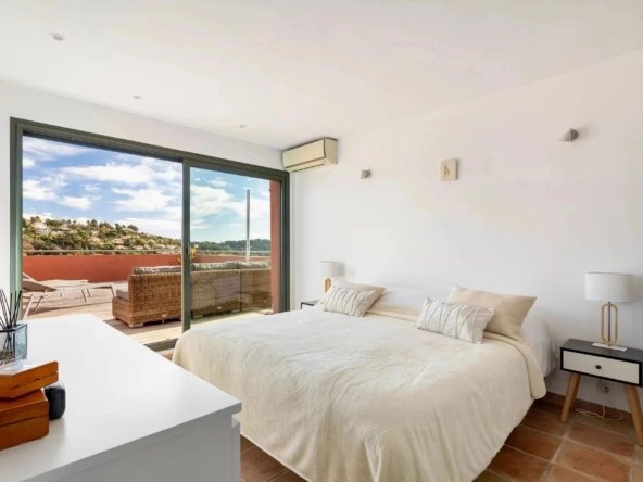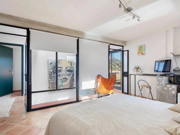 La chambre principale, un sanctuaire personnel, s’ouvre sur un solarium, une terrasse privilégiée offrant une vue panoramique sur les montagnes, les collines et le jardin luxuriant en contrebas.