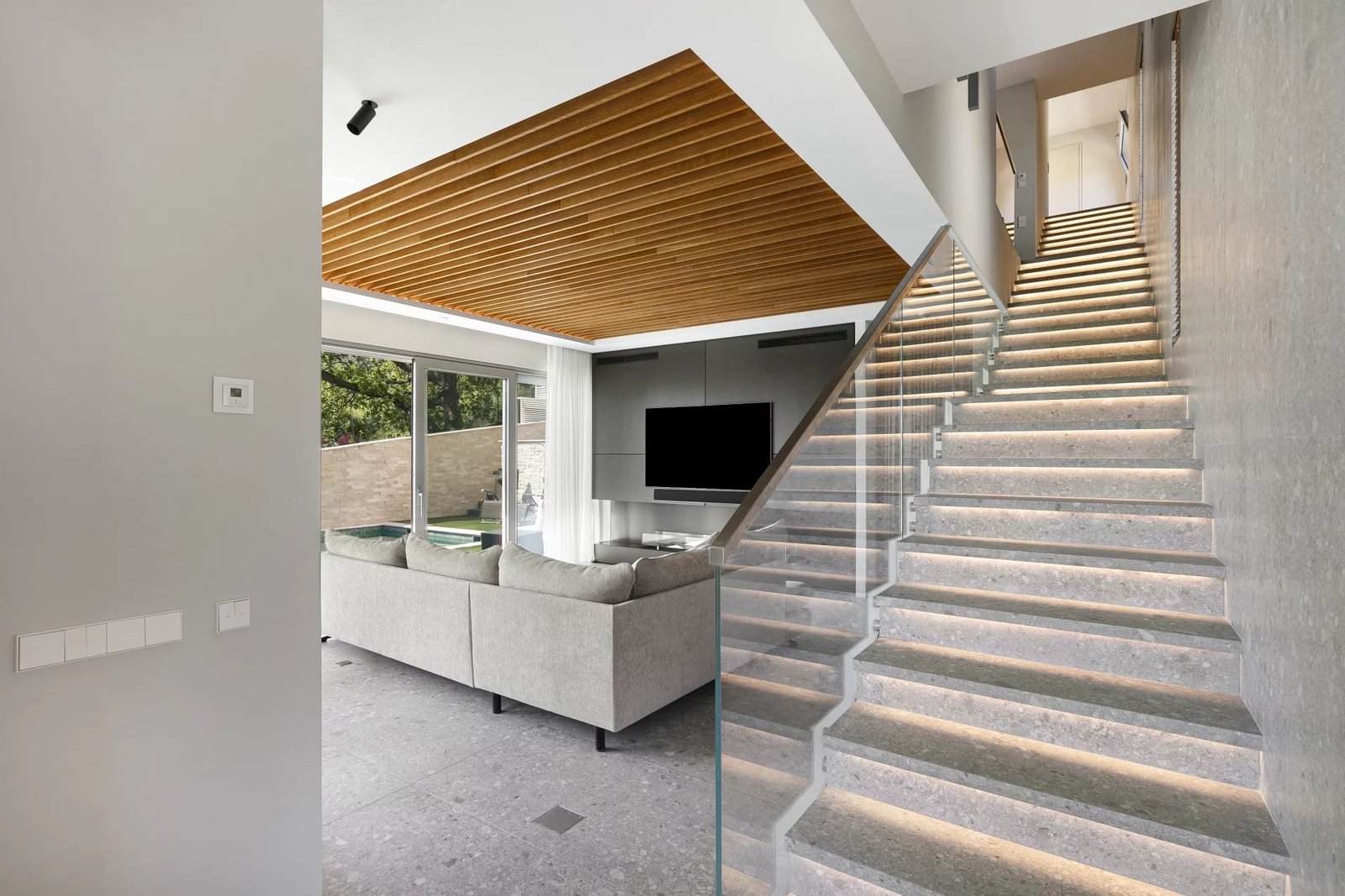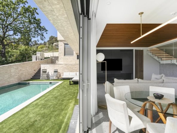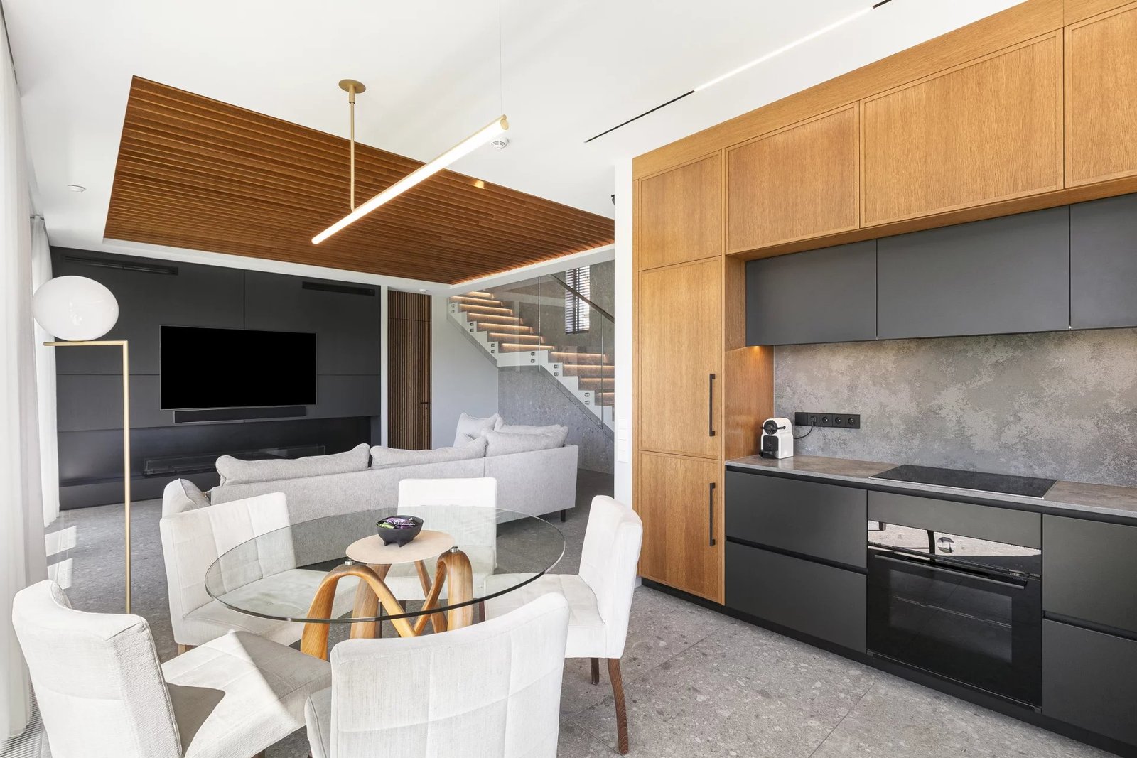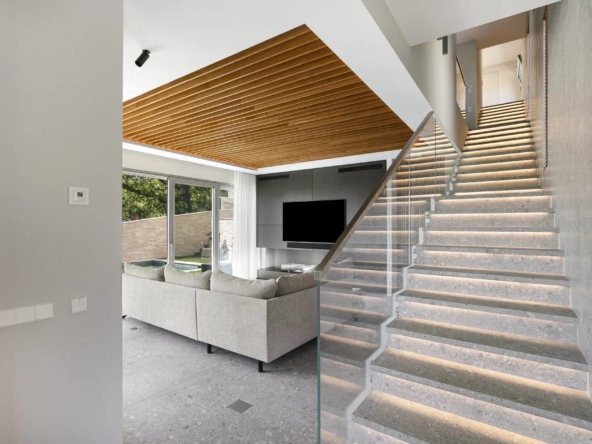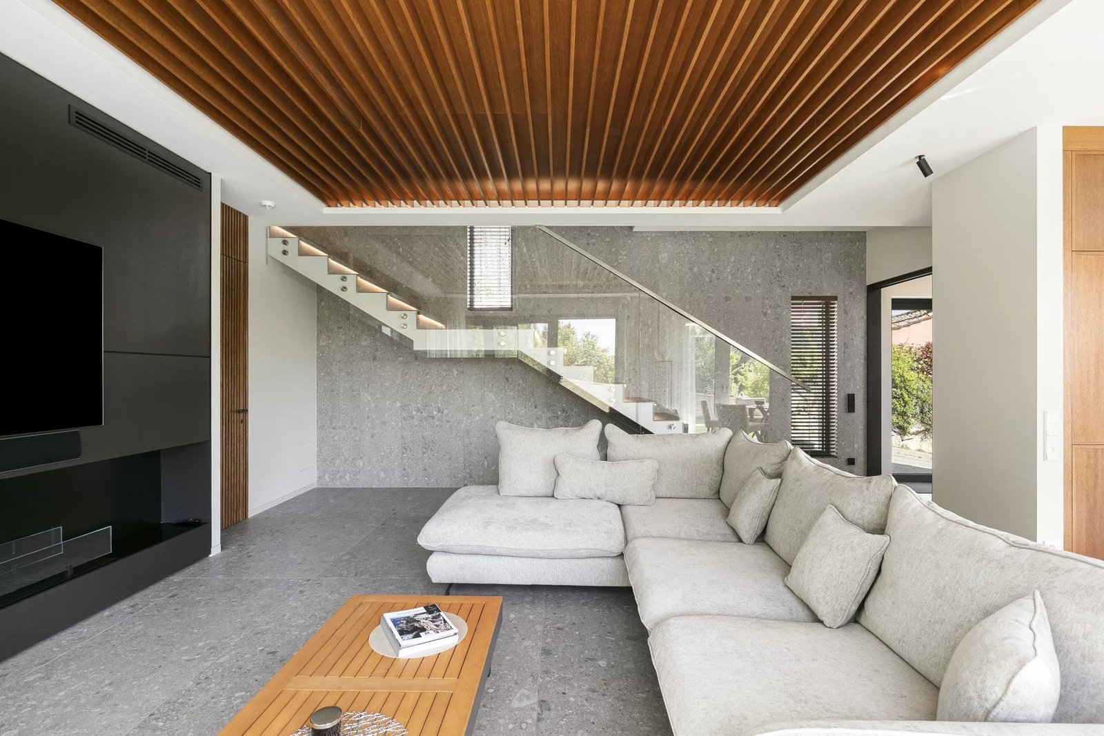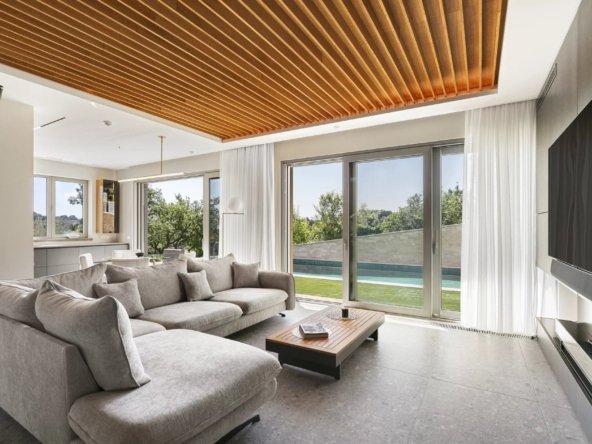 Au rez-de-chaussée : un grand séjour lumineux avec cuisine ouverte, donnant directement sur le jardin et la piscine. Un bureau complète ce niveau, idéal pour le télétravail.