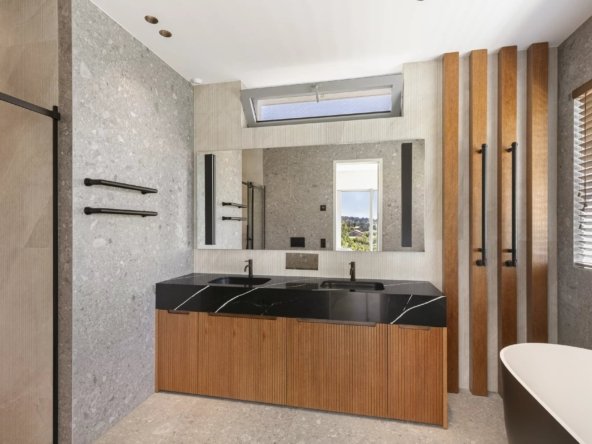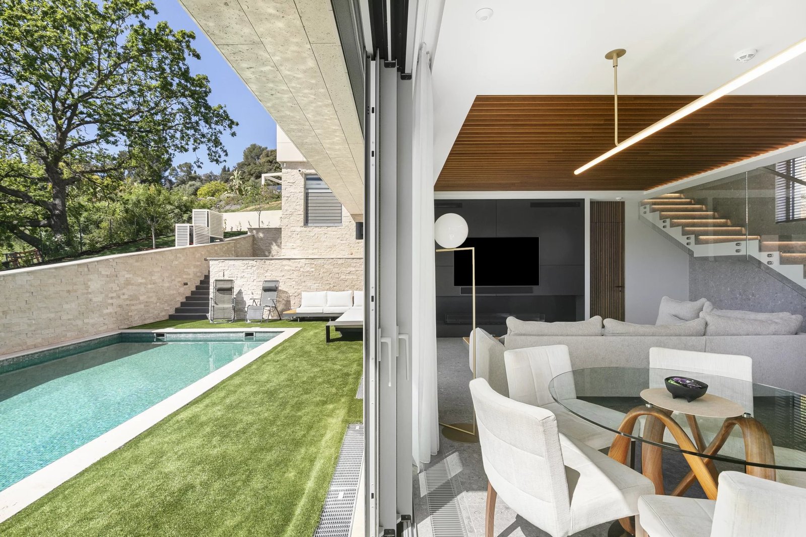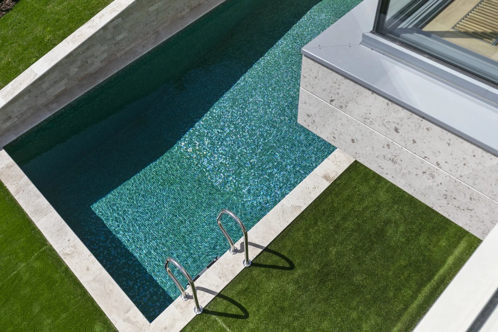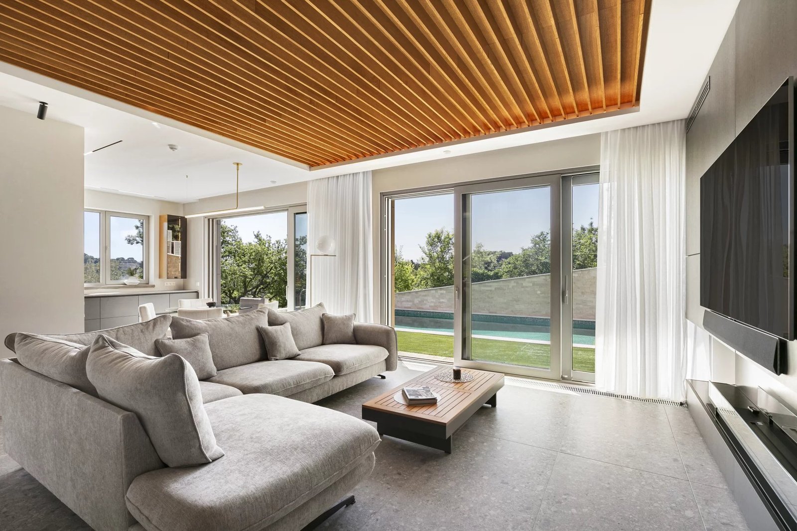 Au rez-de-chaussée : un grand séjour lumineux avec cuisine ouverte, donnant directement sur le jardin et la piscine. Un bureau complète ce niveau, idéal pour le télétravail.