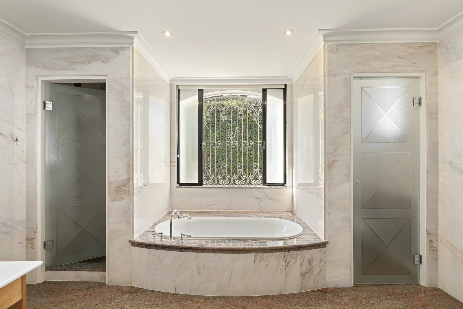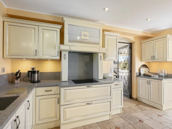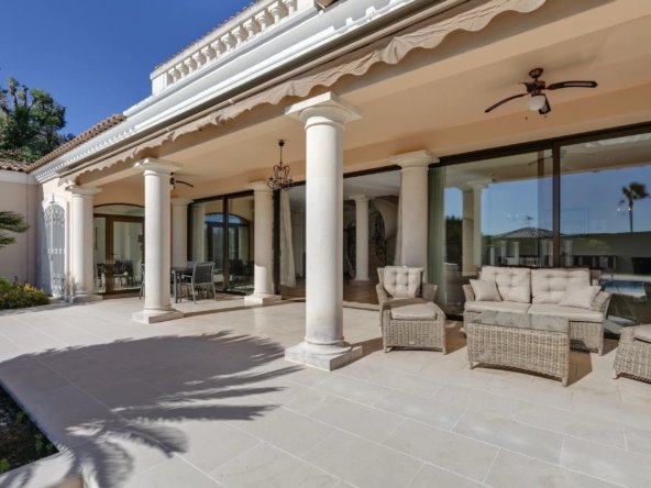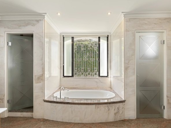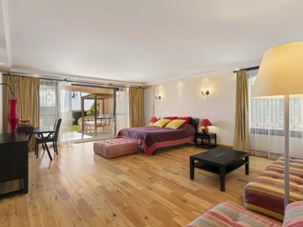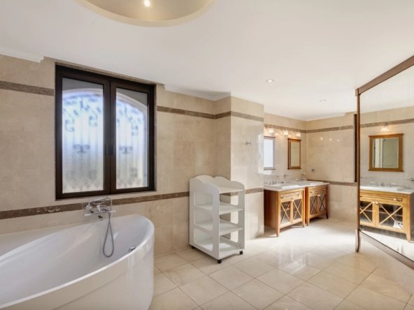 Sur un terrain plat de 2 600 m², elle offre 347 m² d’espaces de vie lumineux, 5 chambres dont 2 suites de maître avec salles de bains en marbre et jacuzzi.